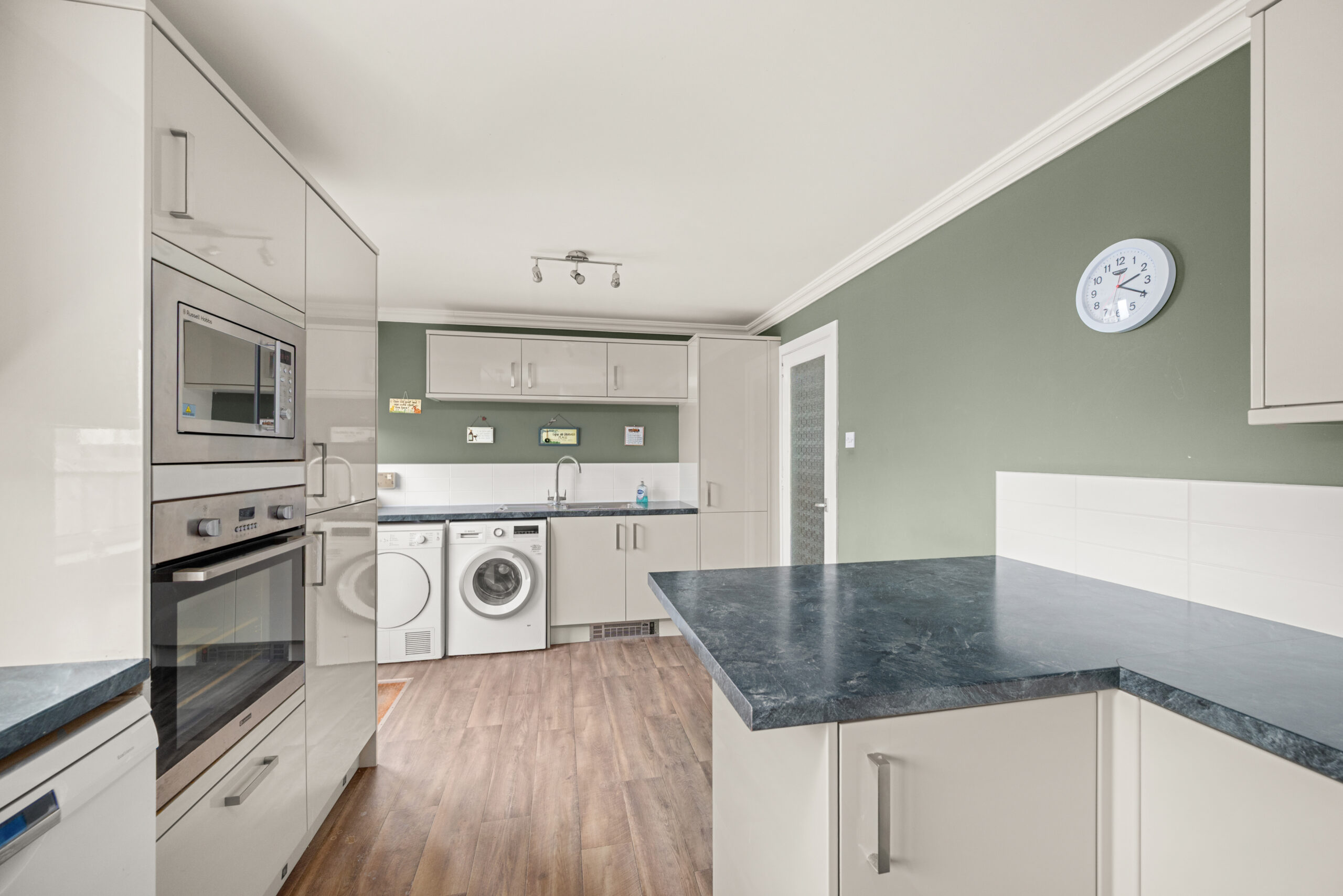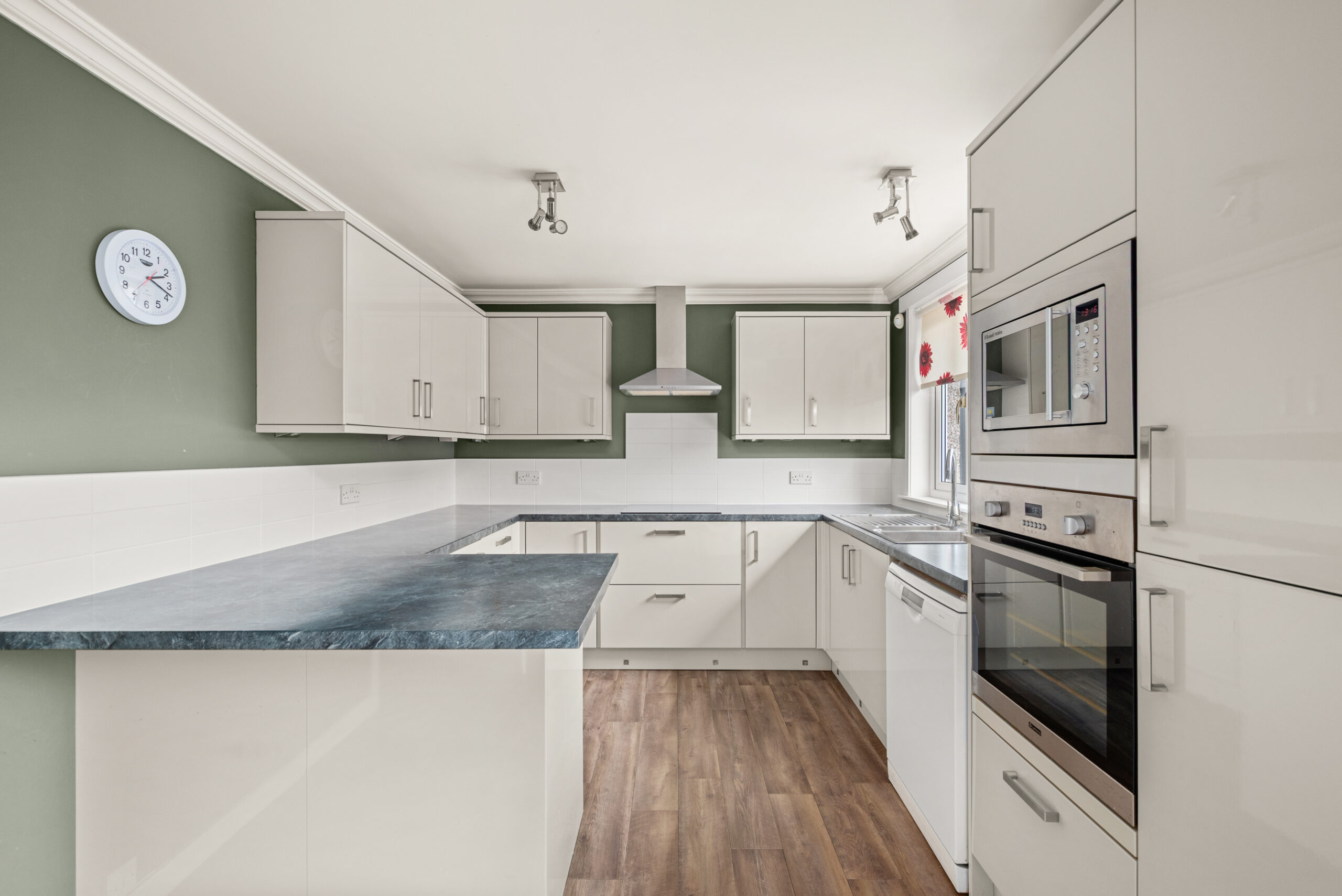 The accommodation is notably spacious, with a bright vestibule opening into a broad, welcoming hallway that sets the tone for the rest of the home. The lounge sits to the front, enjoying views over the garden and centred around a feature fireplace. To the rear, the kitchen is modern and well laid out, with gloss units, integrated appliances and space for everyday dining, along with direct access out to the garden.