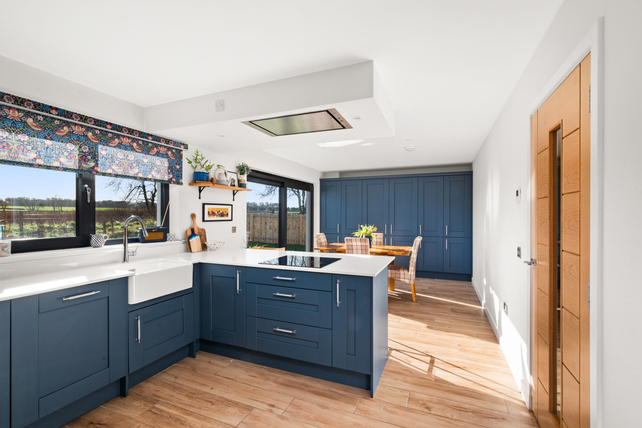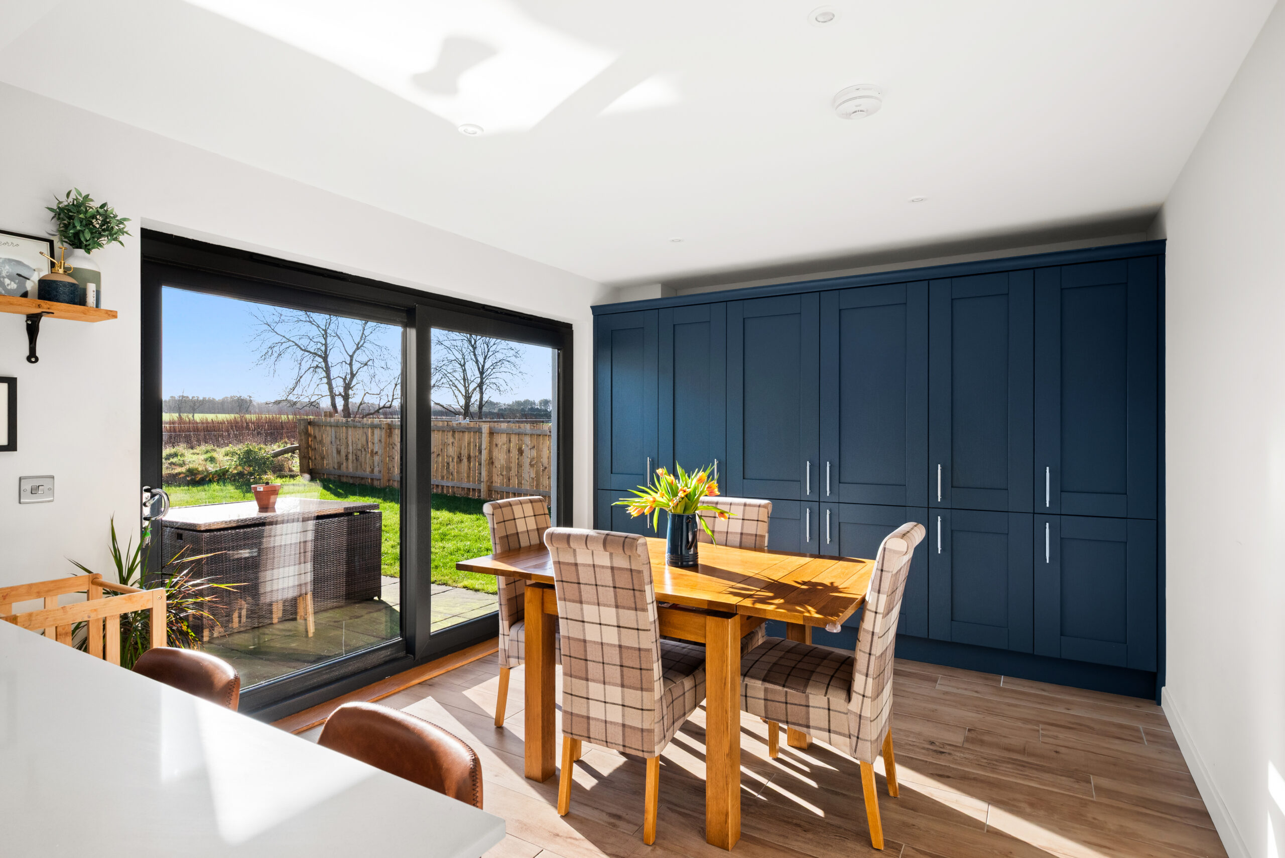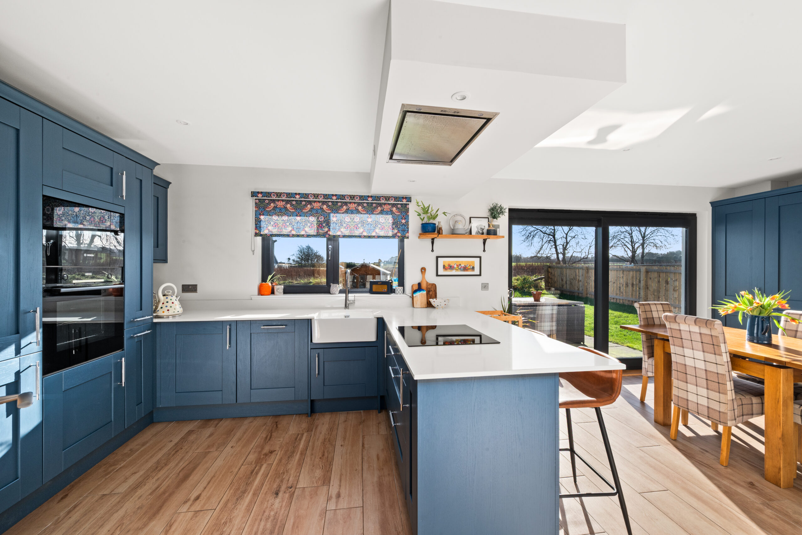 The heart of the house is the generous kitchen/dining room, a sociable space designed for everything from quick breakfasts at the island to relaxed dinners with friends. Deep blue cabinetry, sleek worktops and integrated appliances give it a smart, clean-lined feel, while large sliding patio doors bring the garden into view and open the room up to summer evenings. A separate utility room keeps laundry and storage neatly out of sight, and a ground-floor WC adds welcome practicality.