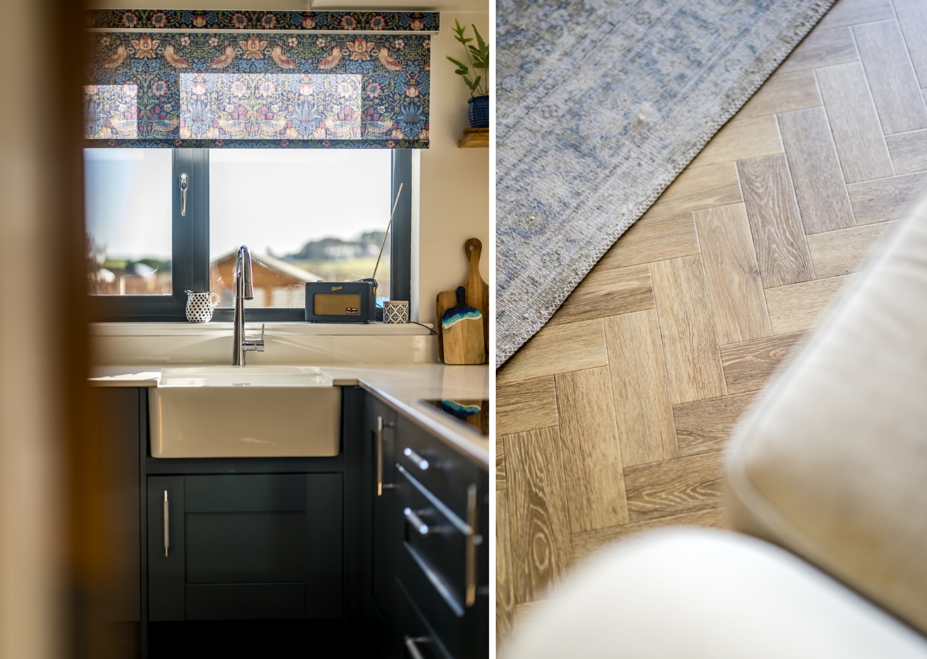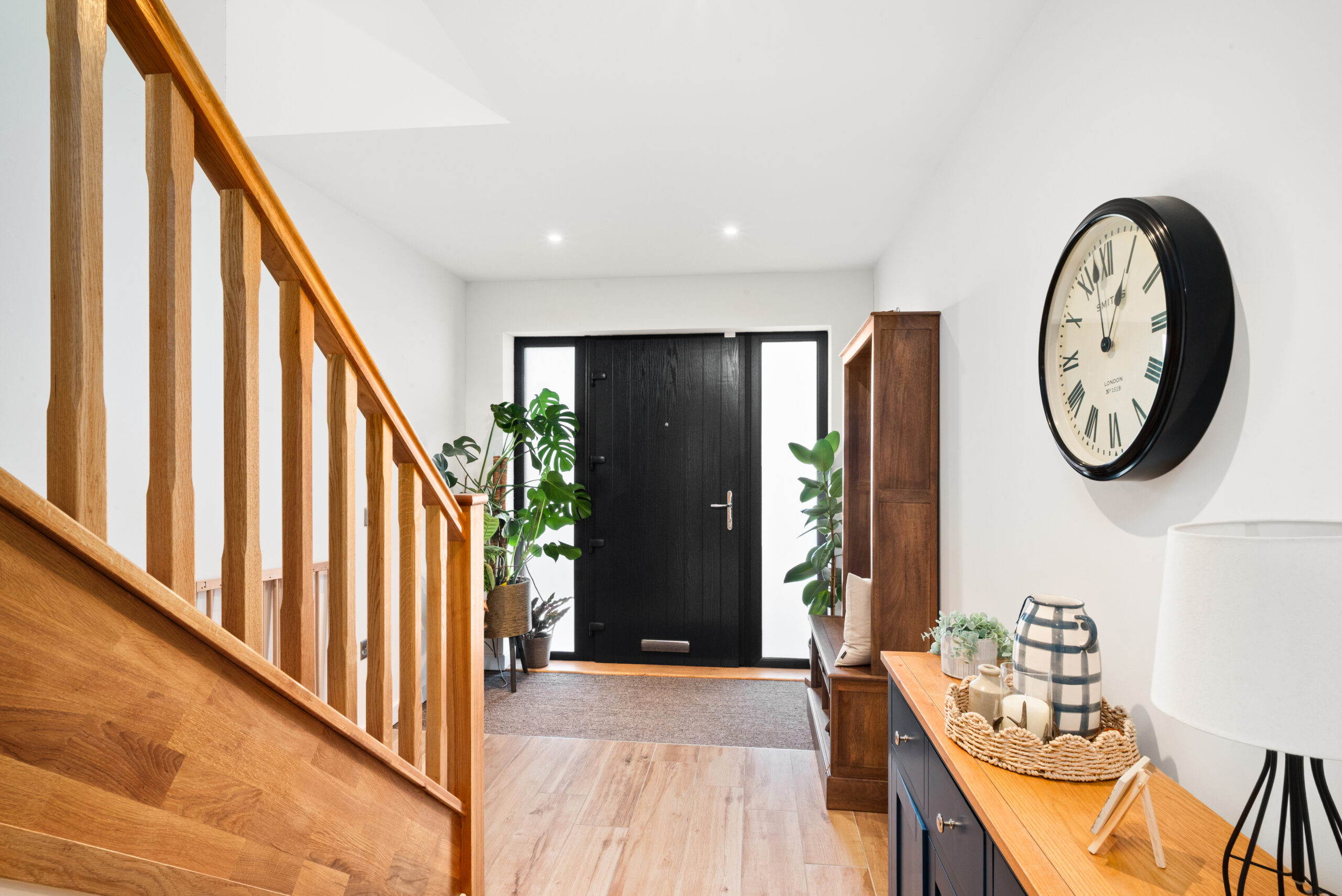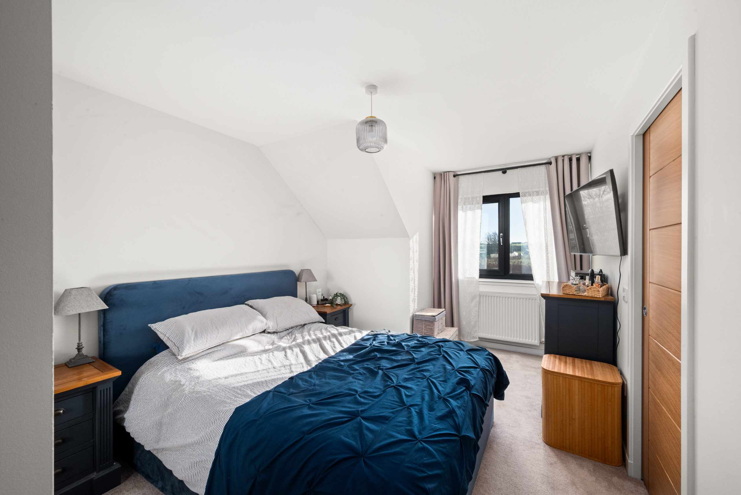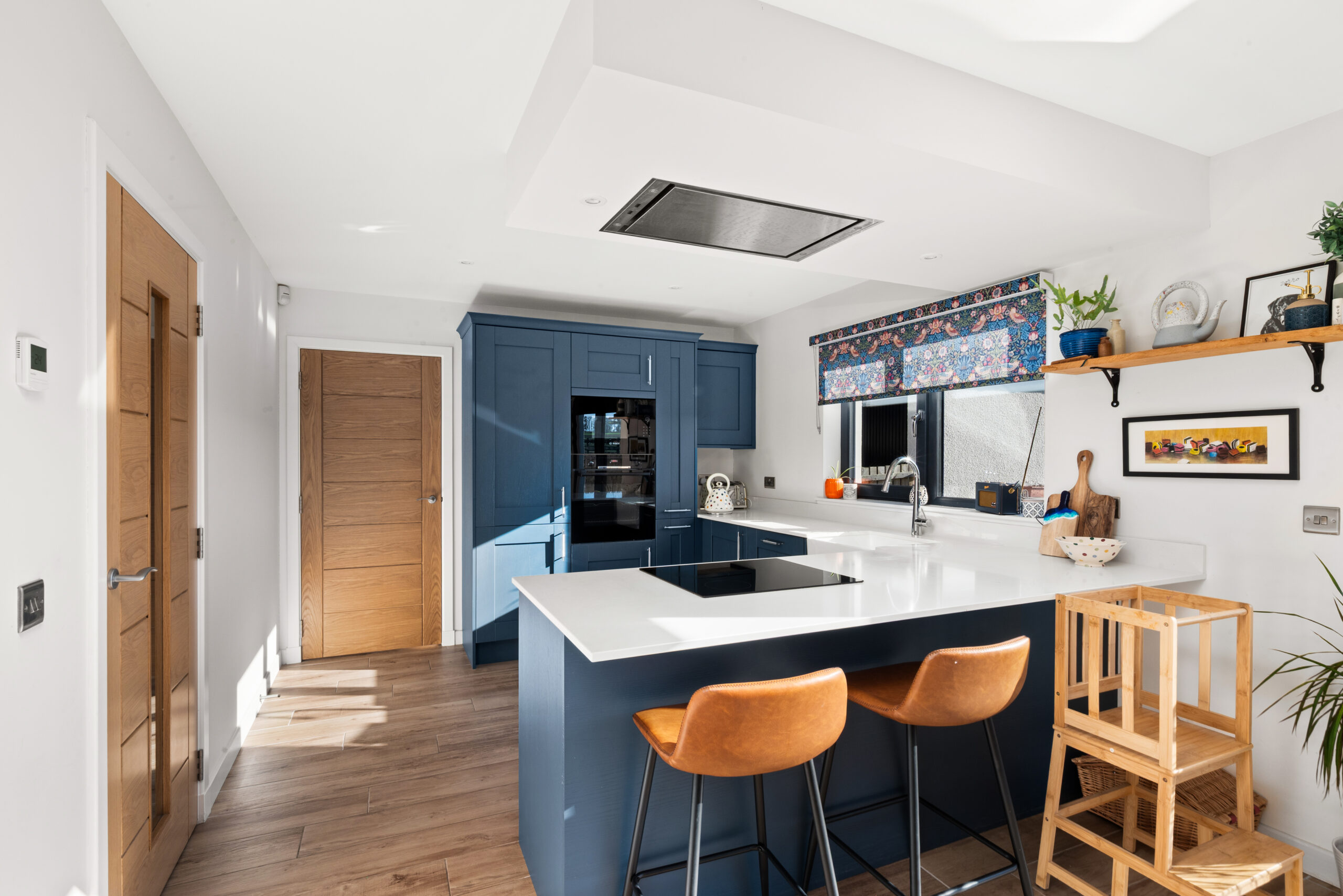 The heart of the house is the generous kitchen/dining room, a sociable space designed for everything from quick breakfasts at the island to relaxed dinners with friends. Deep blue cabinetry, sleek worktops and integrated appliances give it a smart, clean-lined feel, while large sliding patio doors bring the garden into view and open the room up to summer evenings. A separate utility room keeps laundry and storage neatly out of sight, and a ground-floor WC adds welcome practicality.