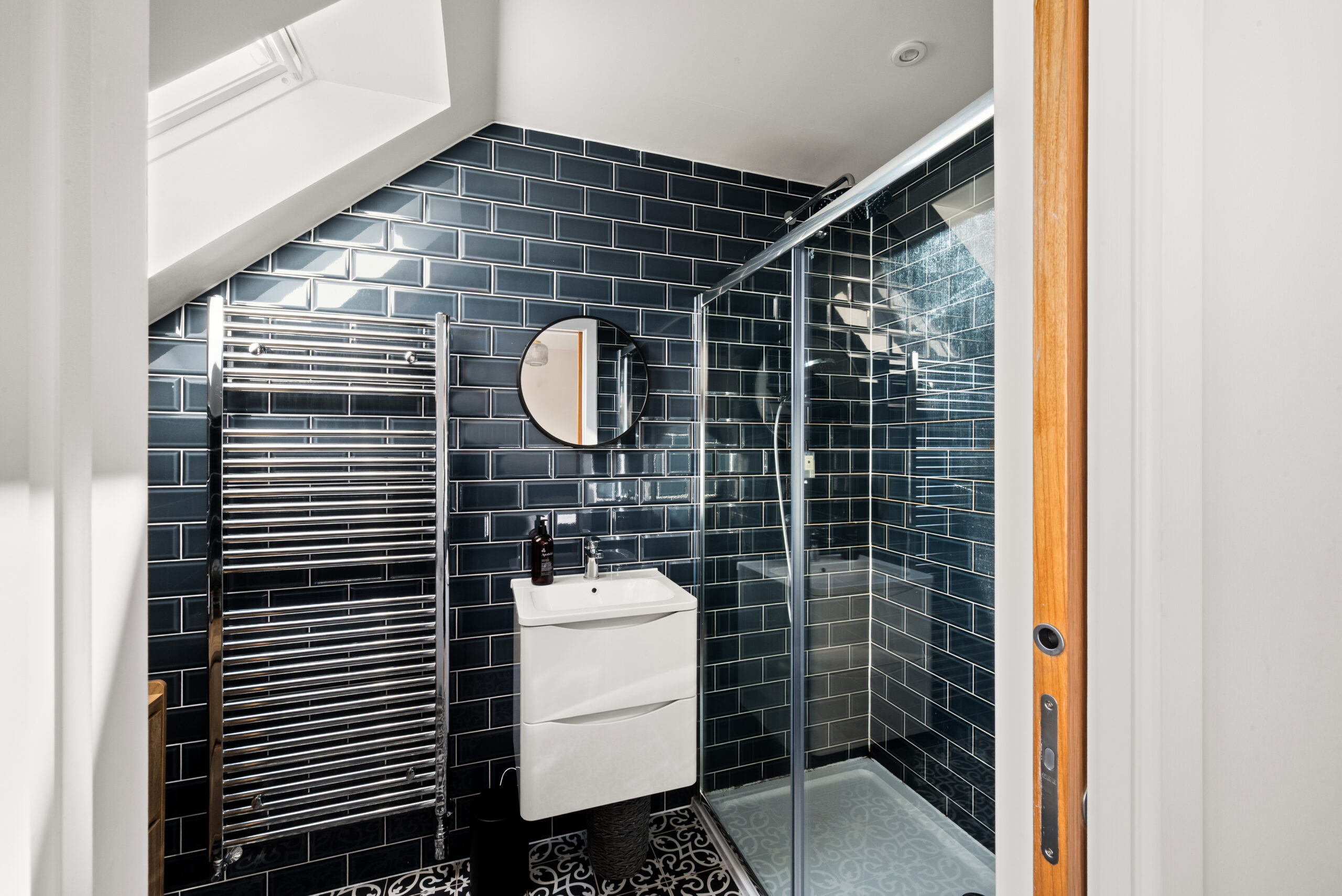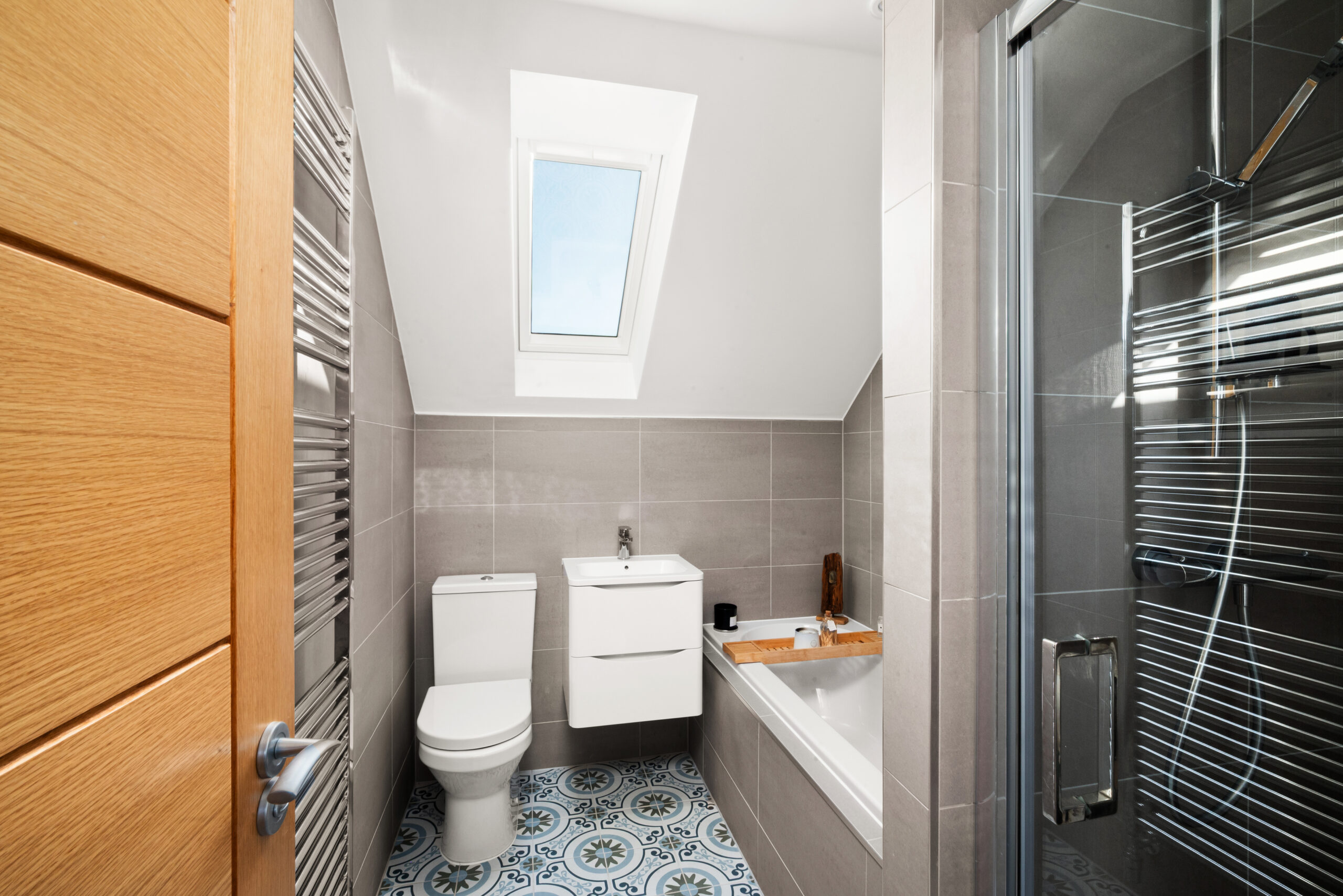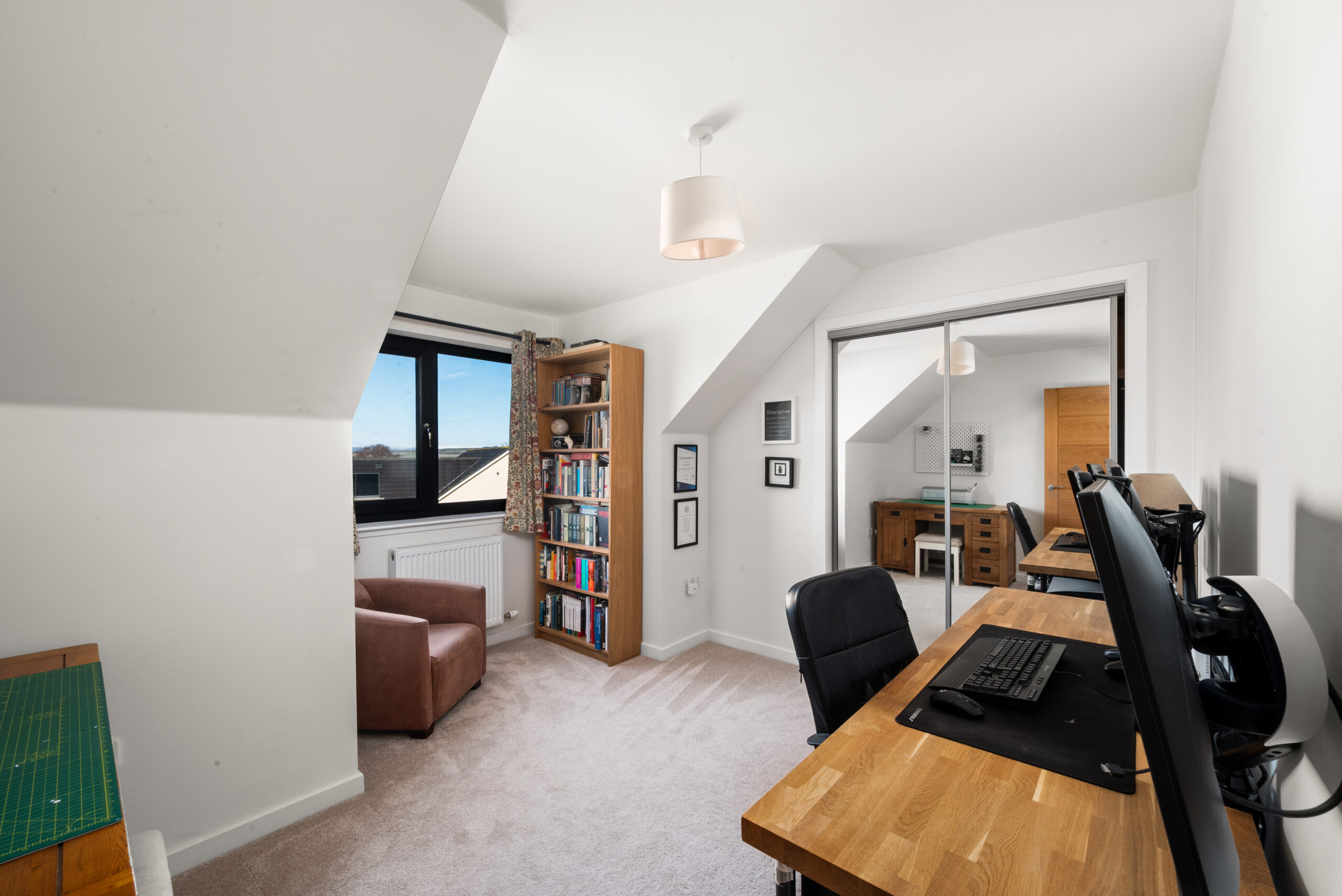 Upstairs, the accommodation is impressively balanced, with four well-proportioned double bedrooms. The principal bedroom enjoys the added luxury of an en-suite shower room, while the remaining bedrooms benefit from built-in wardrobes for storage. A contemporary family bathroom completes the first floor, finished with modern tiling, a bath and a separate shower, and is enhanced by a sky light that keeps the space feeling fresh and airy.