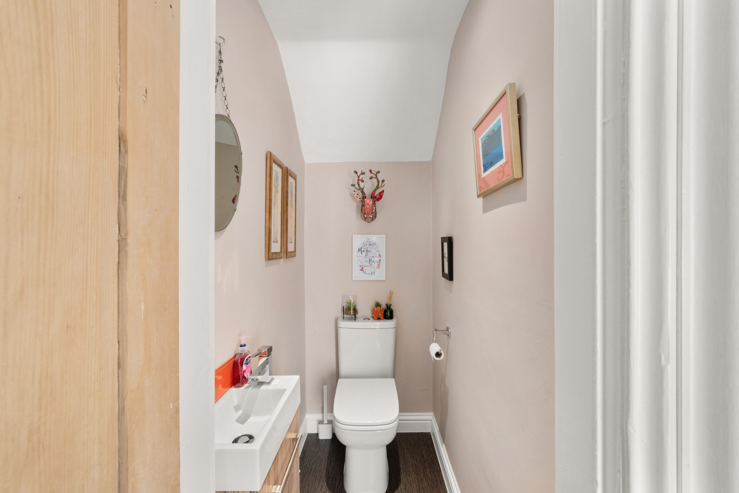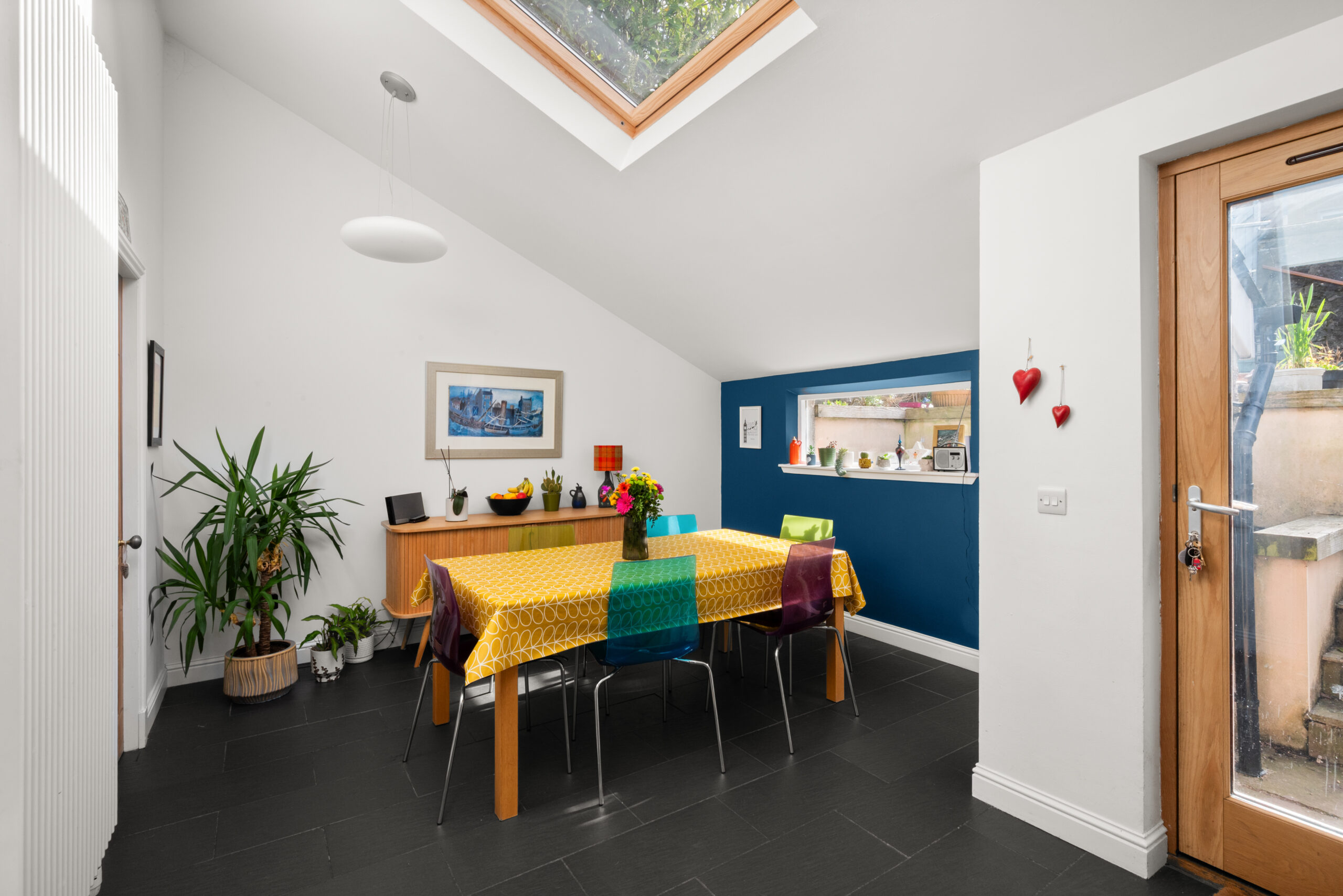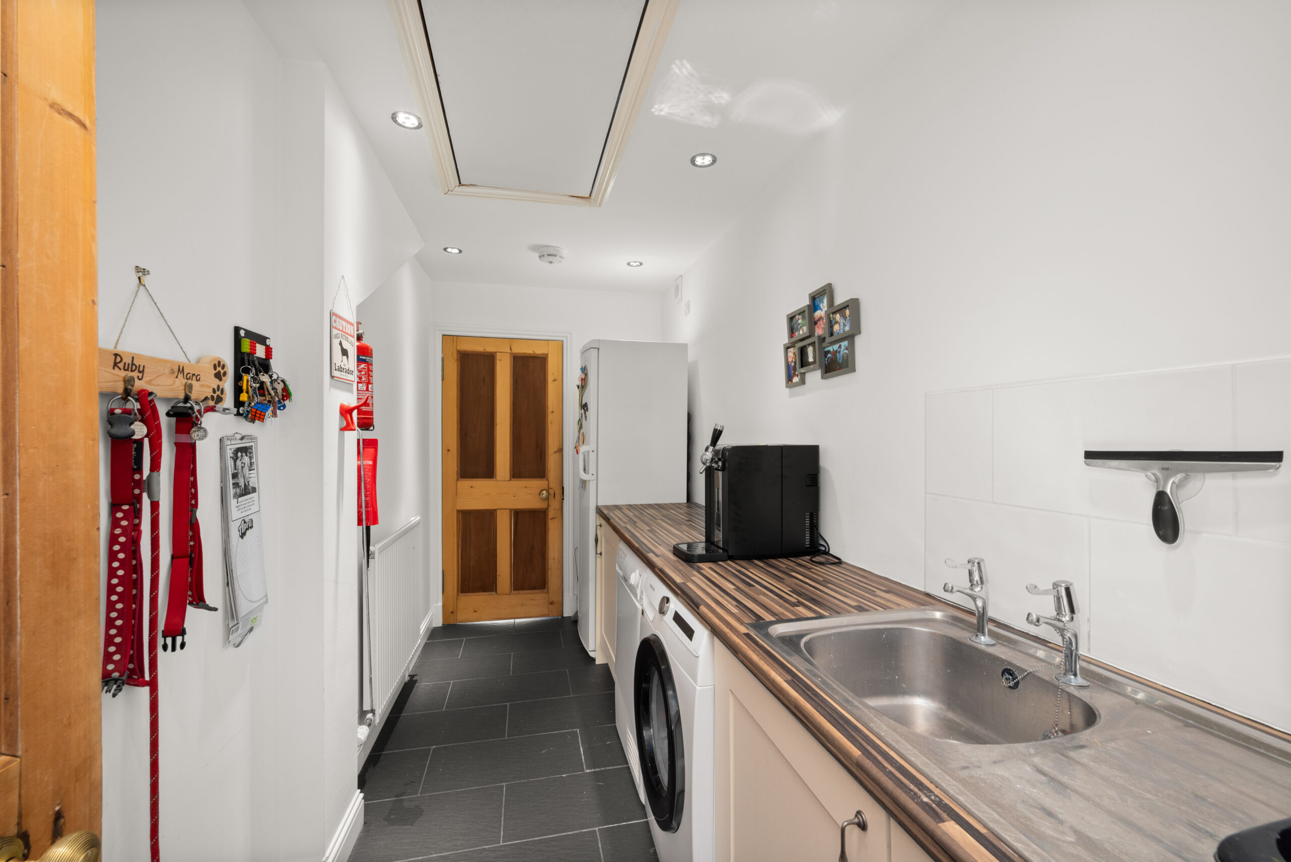 To the rear, the house opens into a superb kitchen, dining and family room that brings a more contemporary feel to the property. Generous in scale and designed for everyday life, this is a space that works beautifully for cooking, dining and relaxing together. The family area feels especially warm and inviting, centred around a wood burning stove that adds both comfort and character, while the dining space sits beneath a large skylight that enhances the natural light and adds to the airy feel of the extension. Just off the kitchen, a useful utility room provides practical additional workspace, while a separate WC completes the ground floor accommodation.