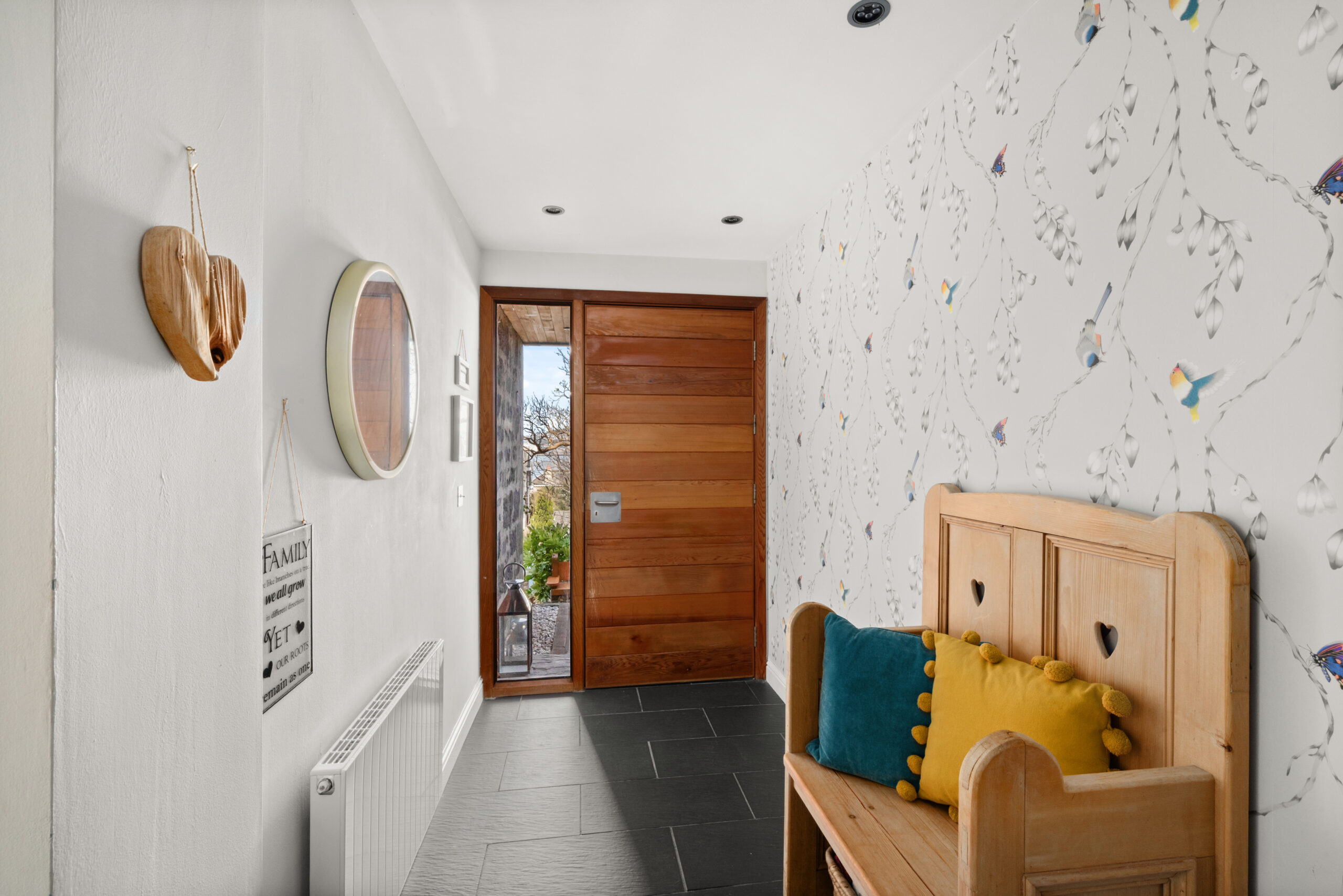 Externally, the property is equally appealing, with a beautifully maintained front lawn and enclosed garden space offering room to sit out, entertain or simply enjoy some time outside. Traditional stone boundary walls add to the sense of privacy and character, while the timber garage is a particularly useful addition, completing the outside space nicely.