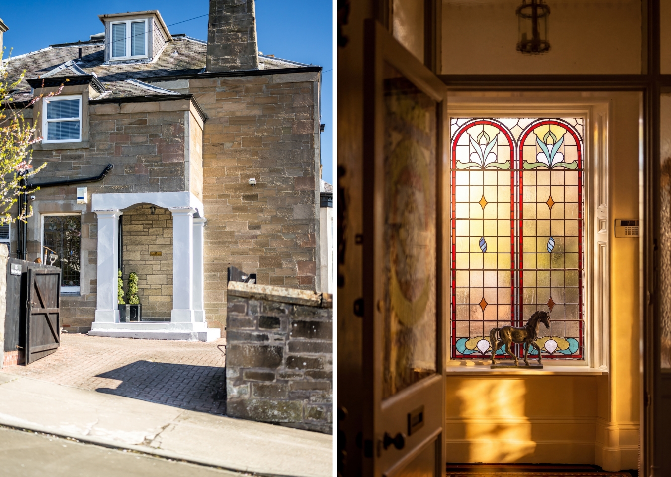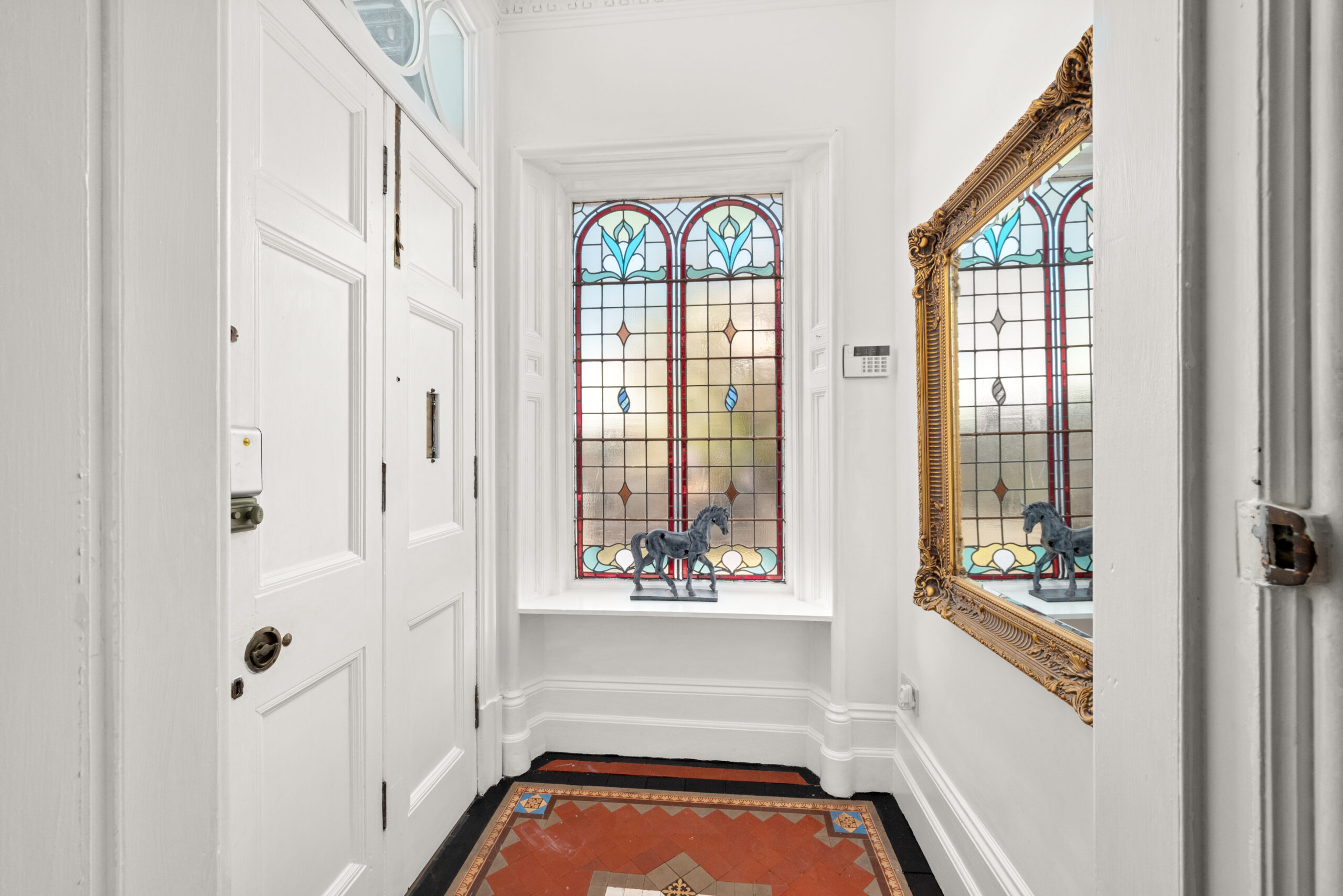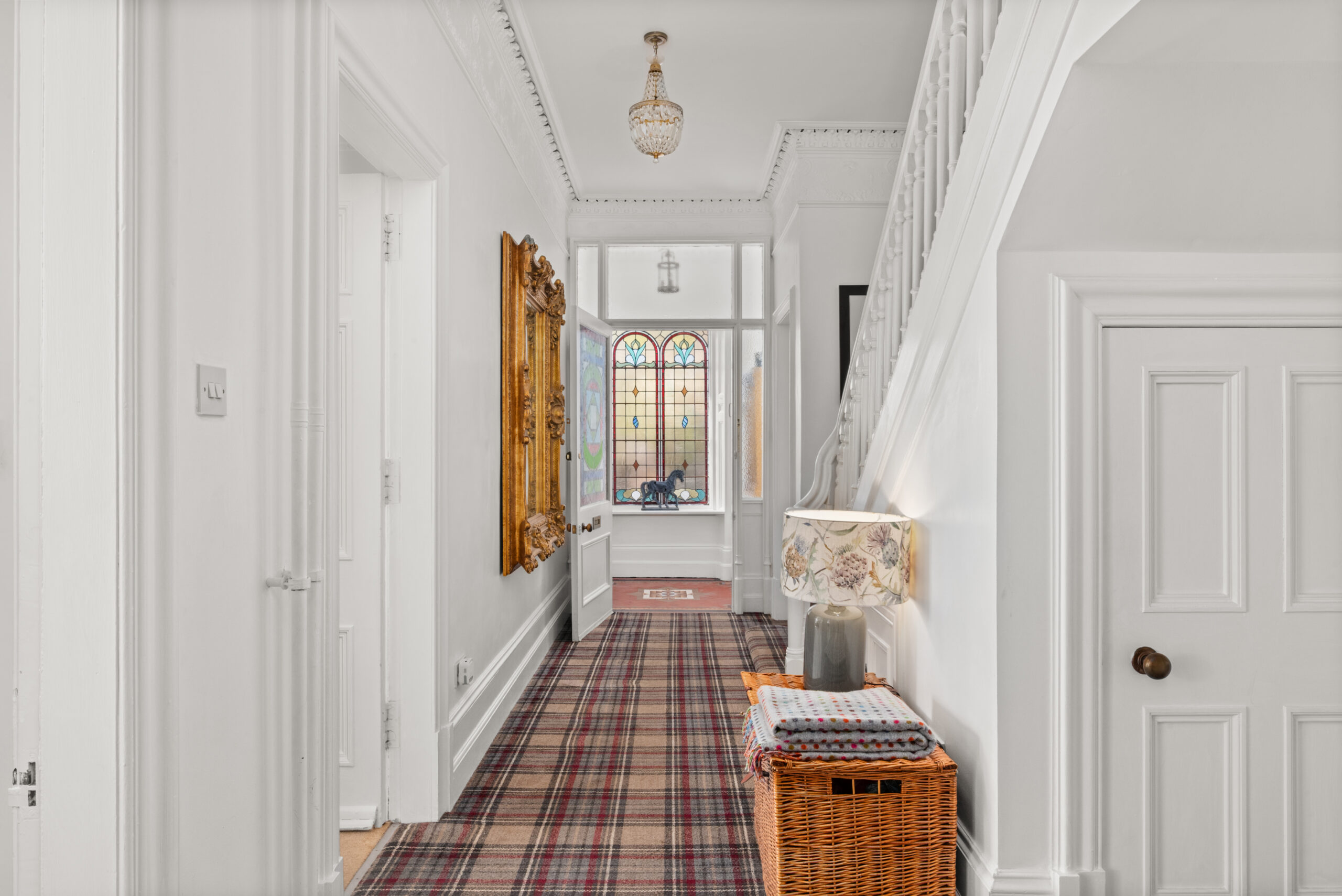 A gated entrance, stone frontage and landscaped grounds make an immediate impression from the street. Inside, the entrance hall is striking: a sweeping staircase, intricate cornicing and a stained glass vestibule that sets the tone for everything that follows.