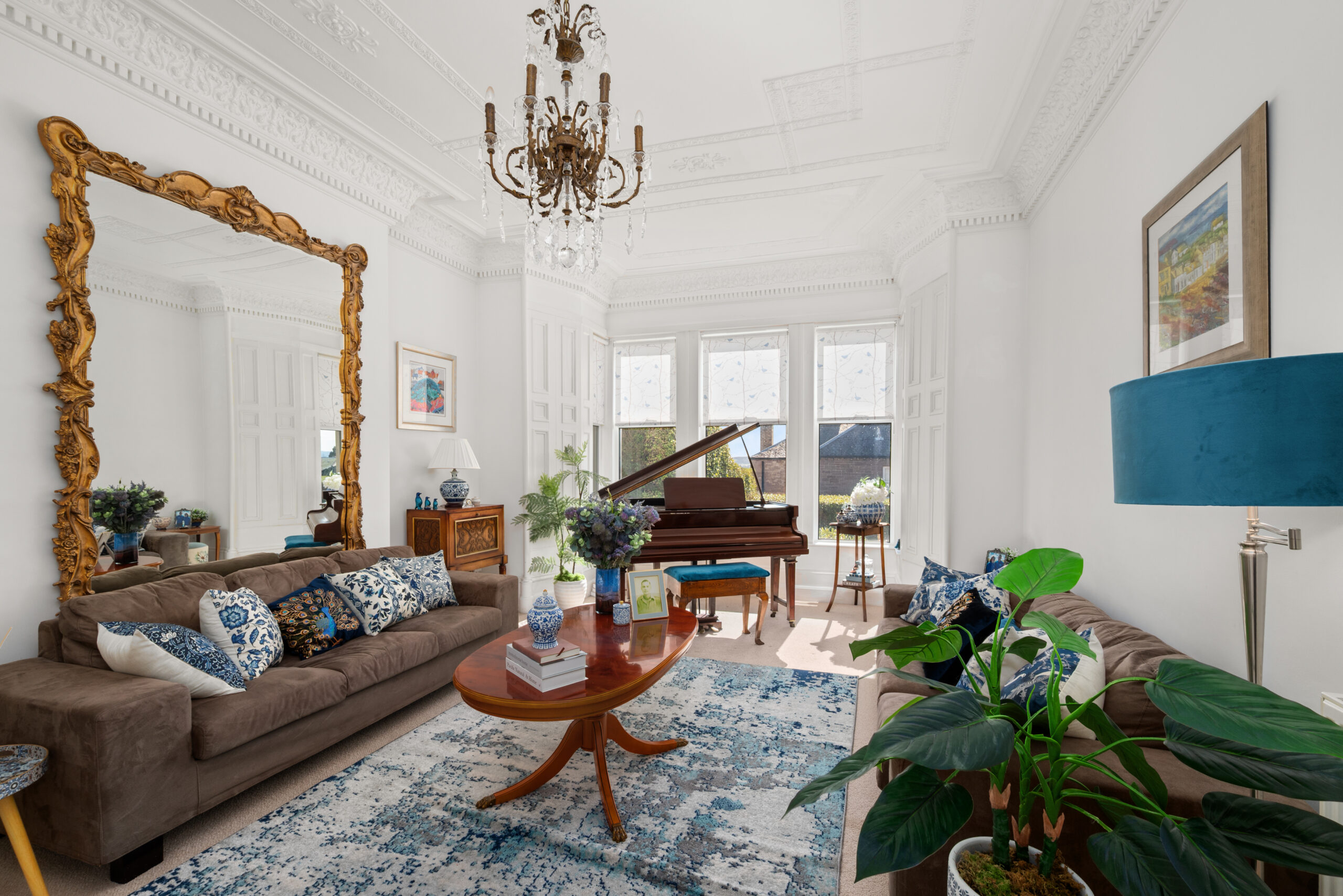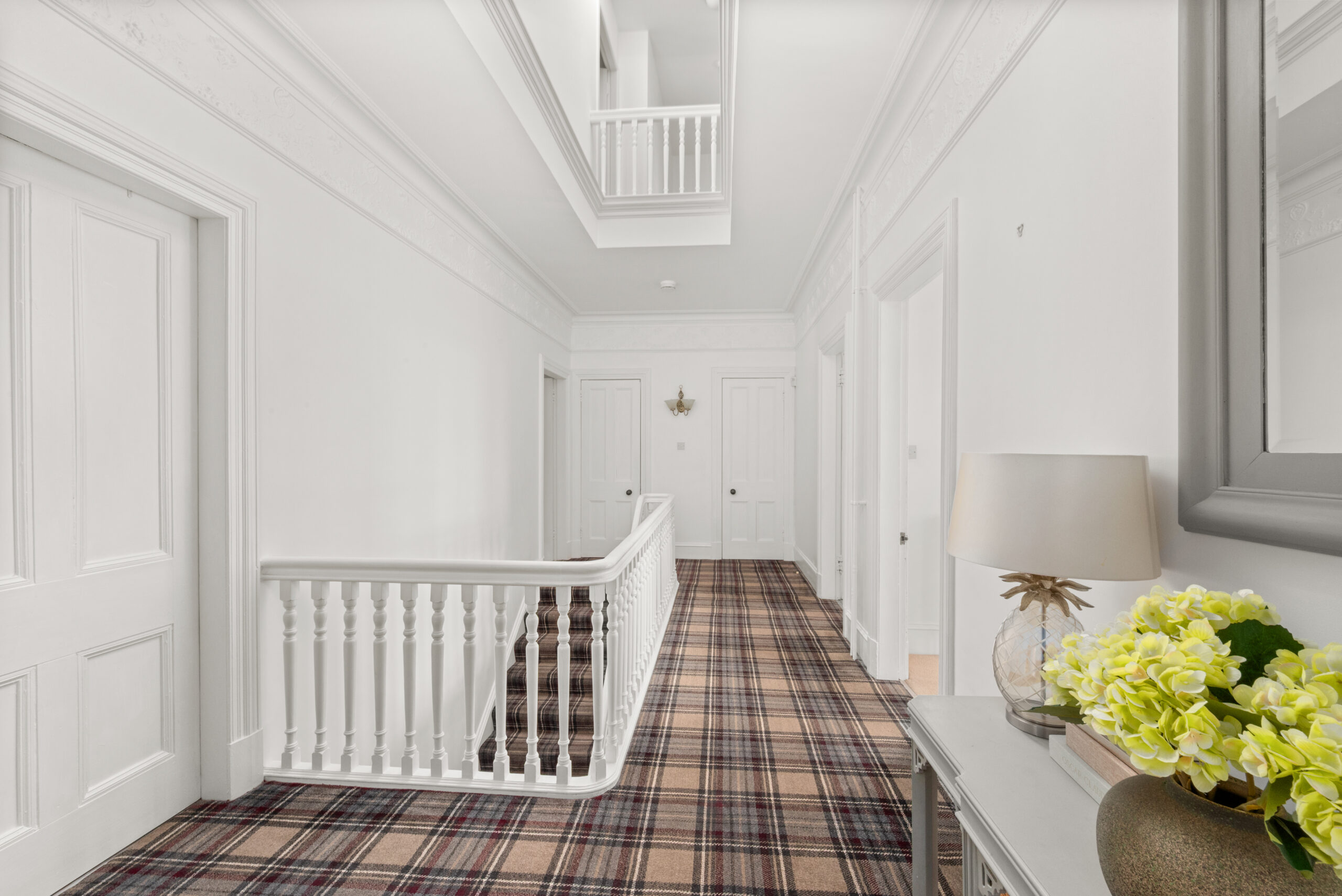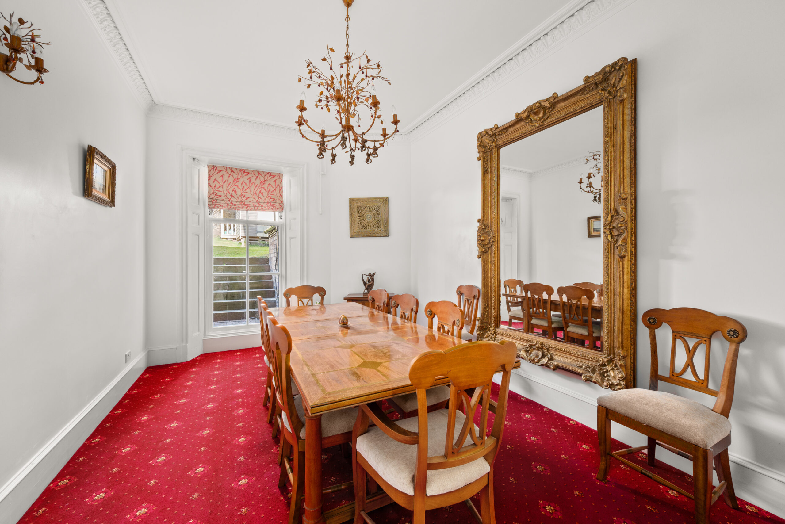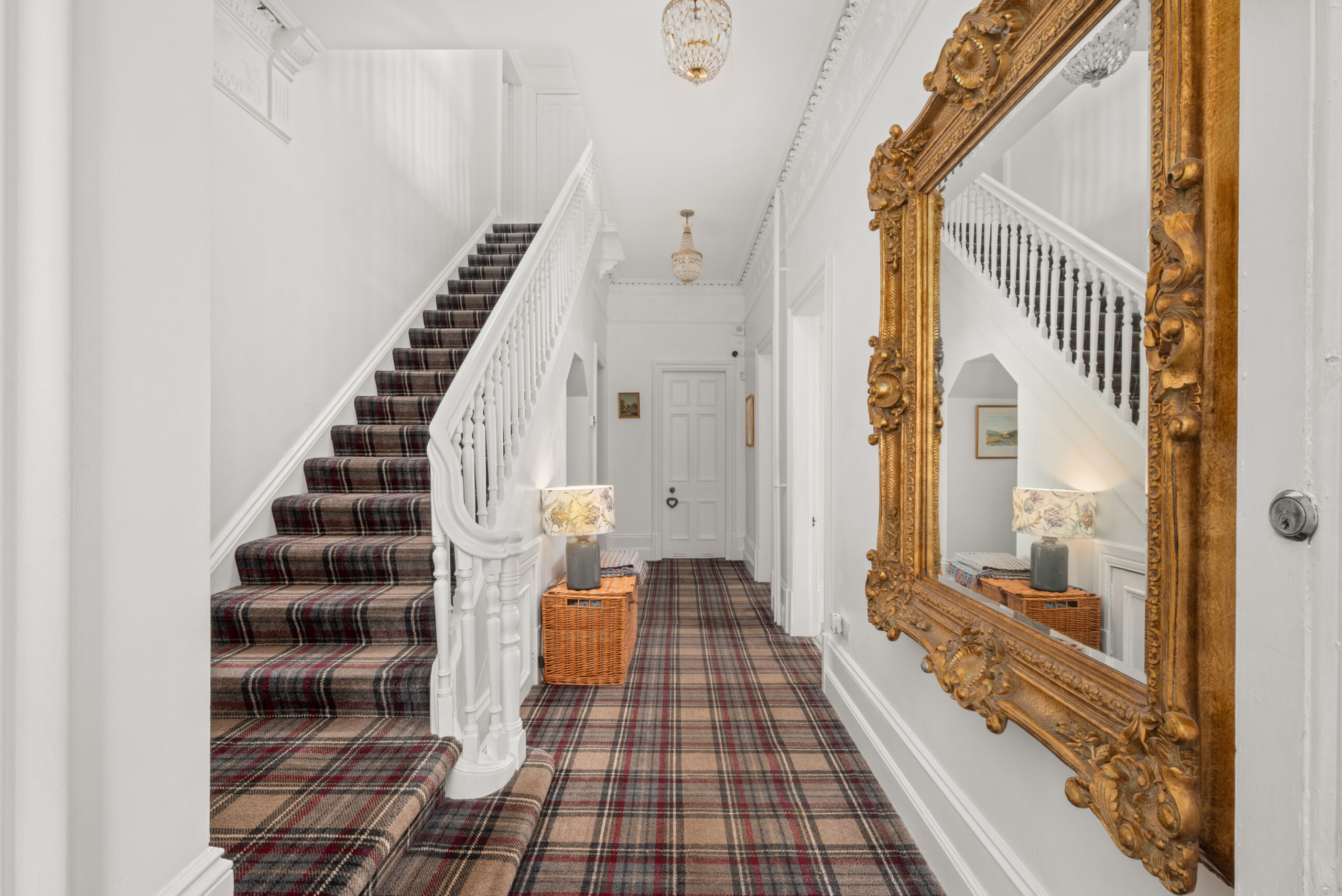 A gated entrance, stone frontage and landscaped grounds make an immediate impression from the street. Inside, the entrance hall is striking: a sweeping staircase, intricate cornicing and a stained glass vestibule that sets the tone for everything that follows.