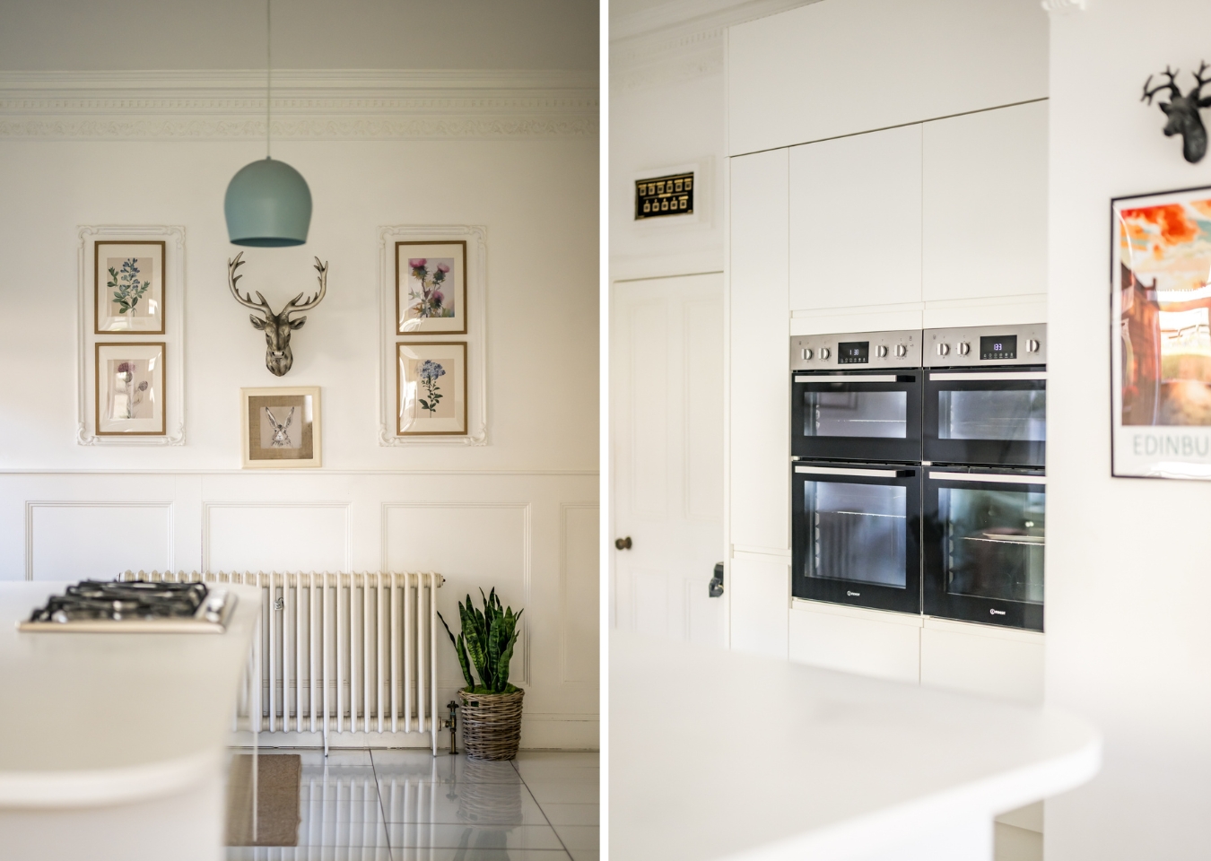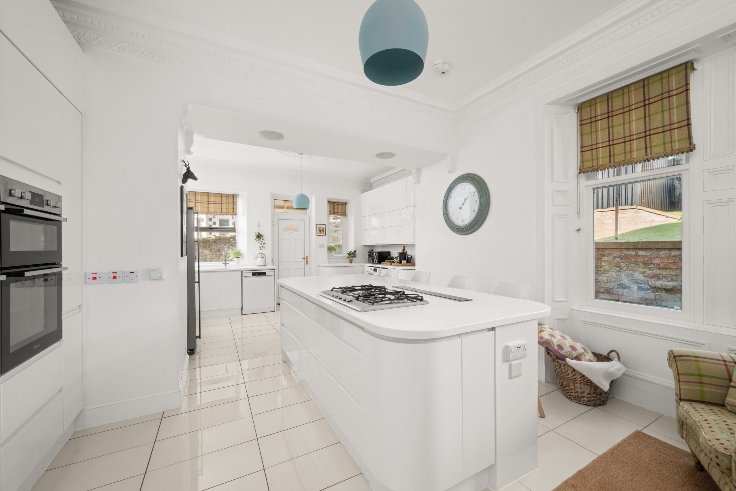 The kitchen is a modern contrast, bright and contemporary, with a large central island, gas hob, integrated double oven and American fridge freezer. A large pantry sits alongside.