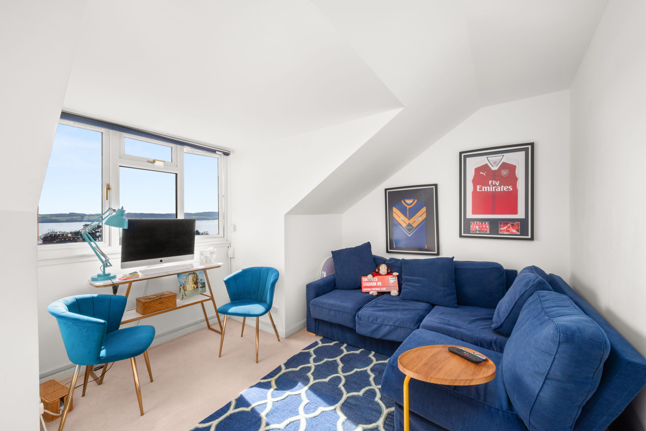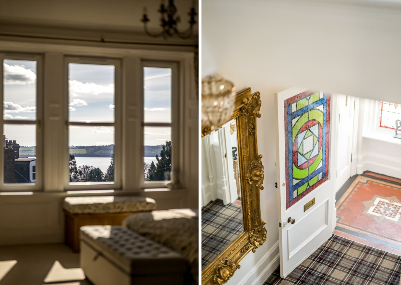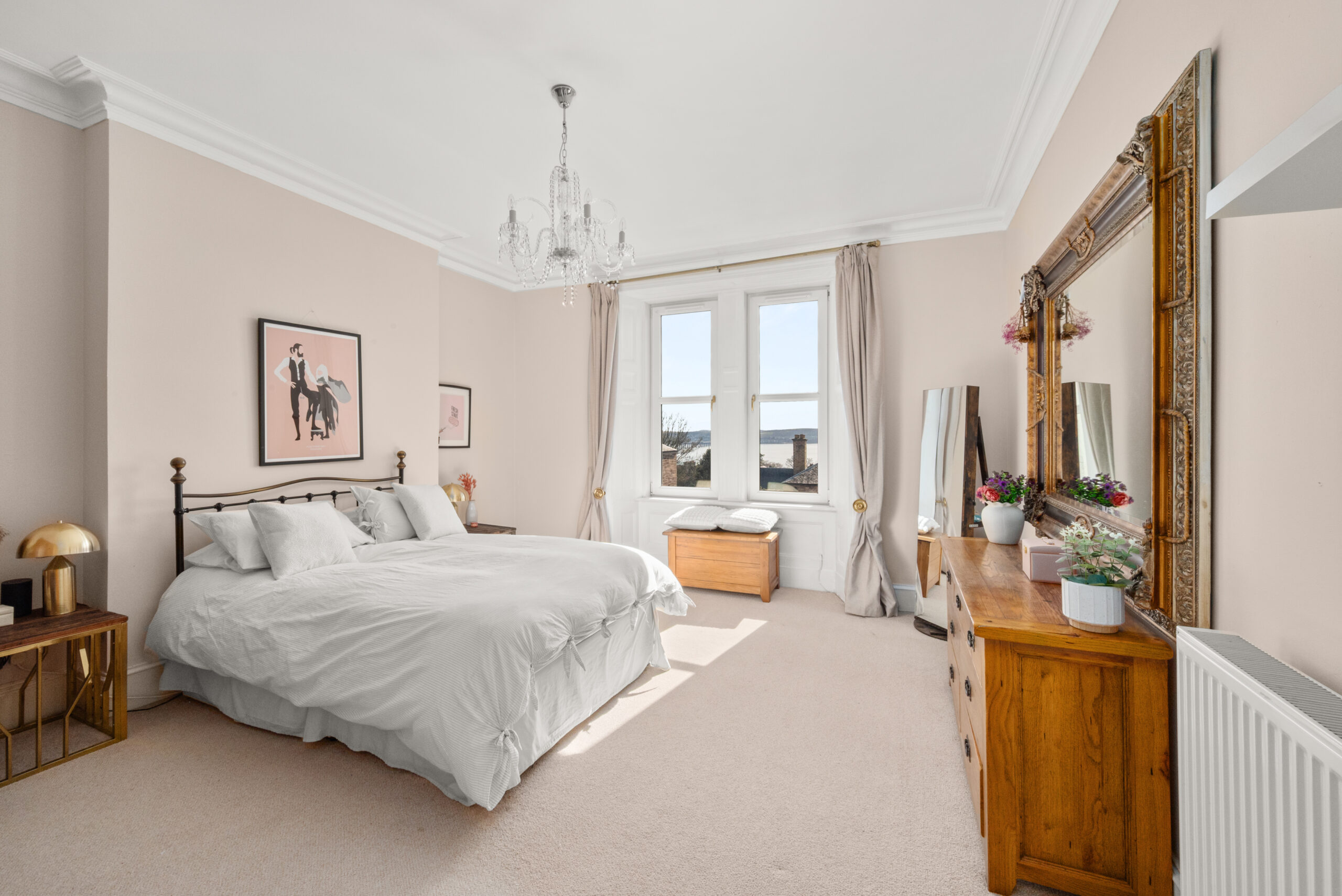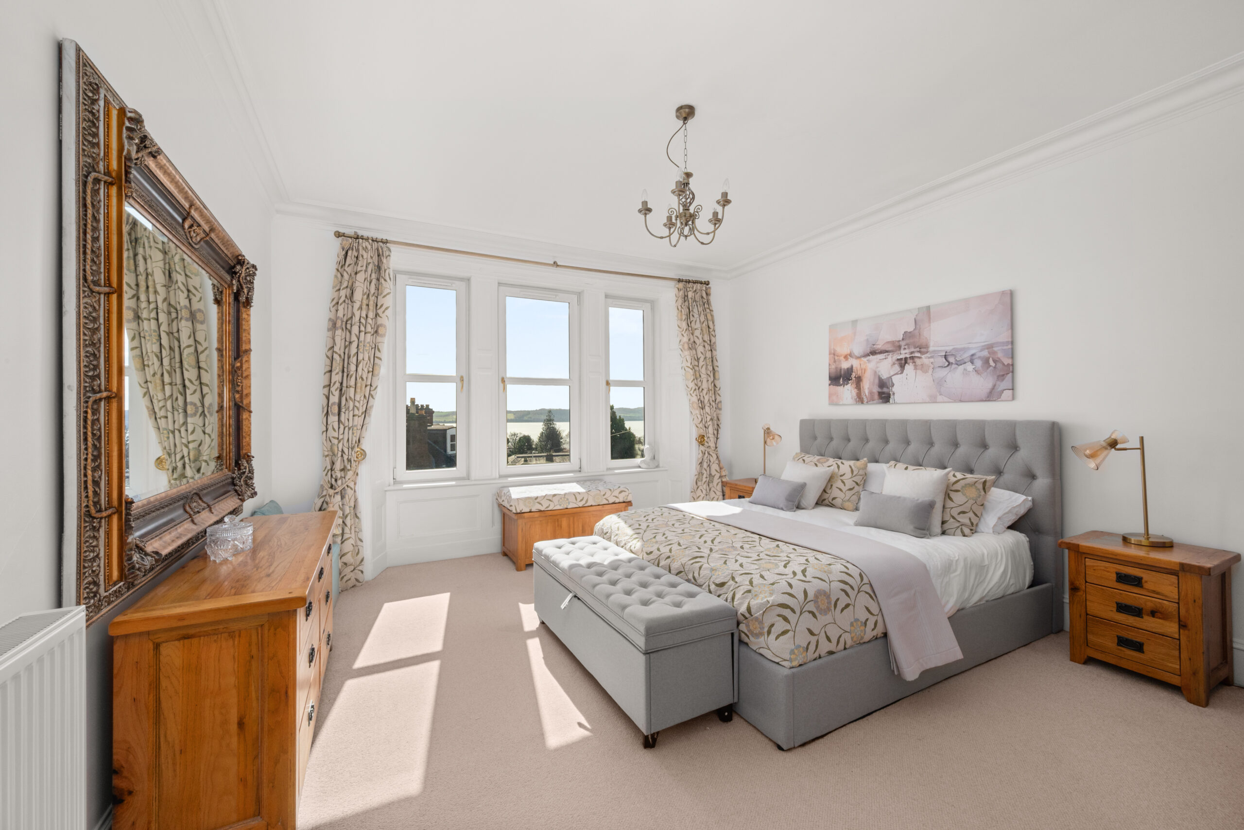 Across the upper floors, seven bedrooms, a bathroom, shower room and upper bathroom provide accommodation that scales easily across guest rooms, family bedrooms and dedicated workspace. The main bedroom is a calm space with a built-in window seat and windows that frame an open Tay panorama. On a clear day, the view carries well into the distance.