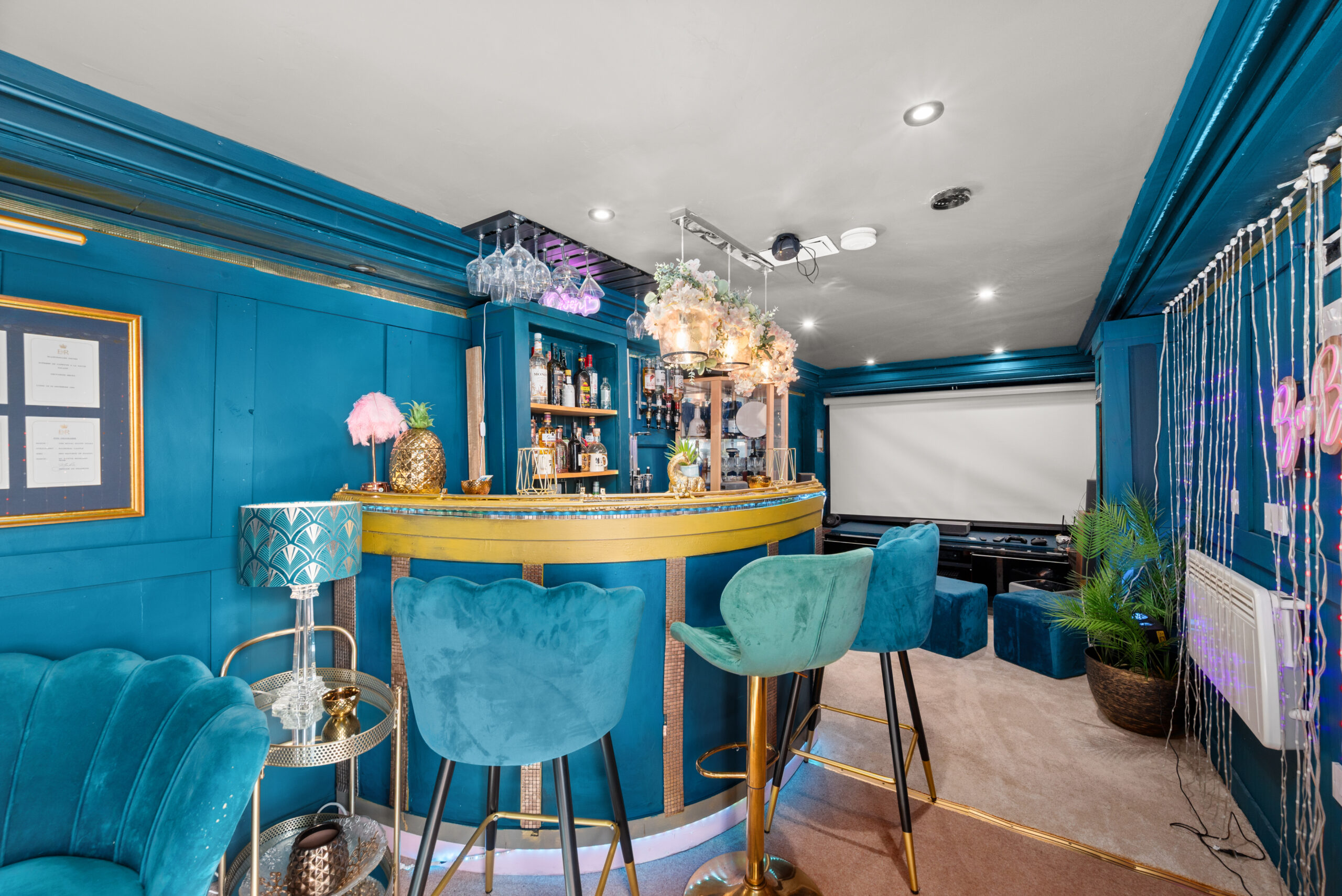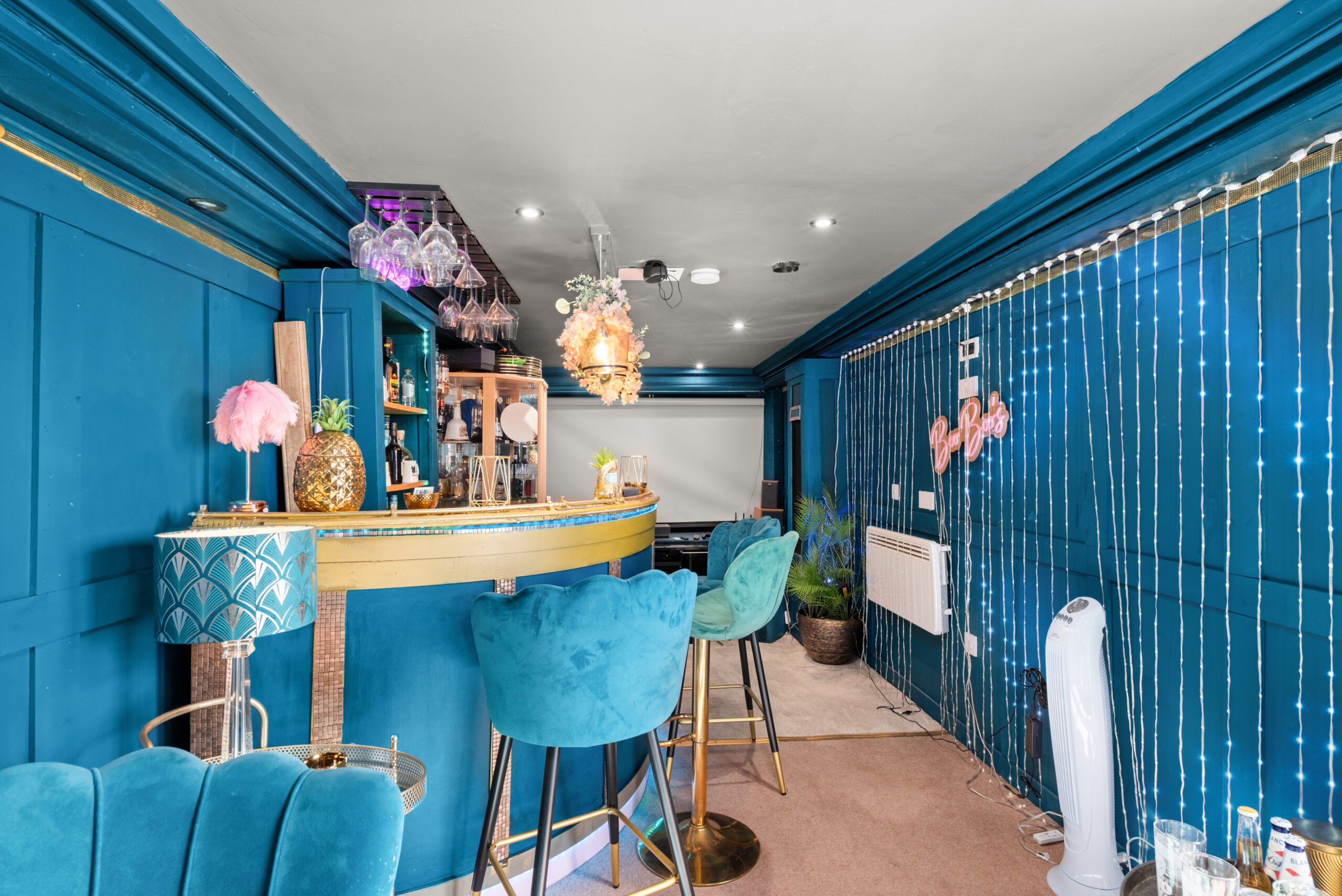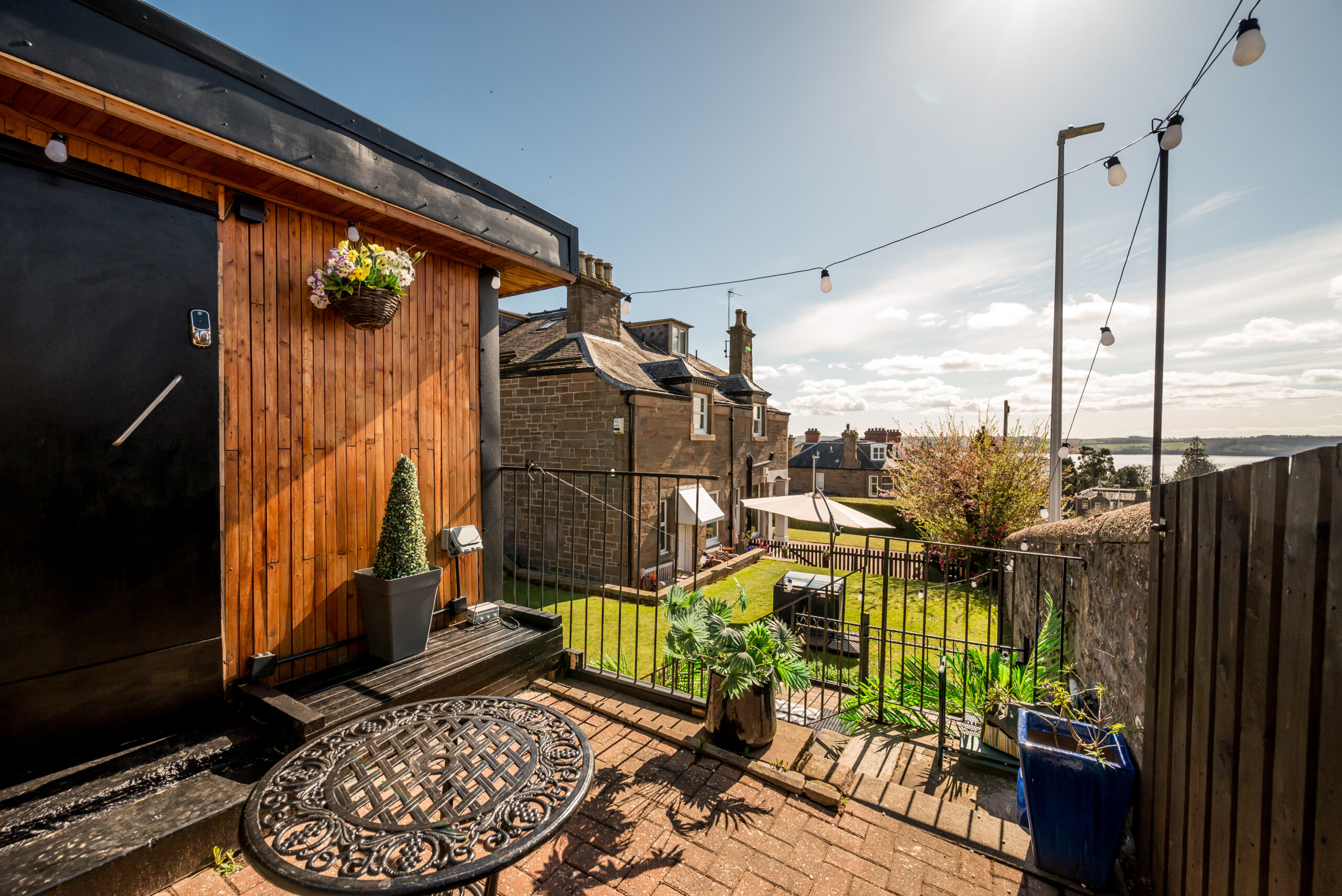 In the grounds, a substantial converted outbuilding clad in cedar and dark timber has been fitted out as a private entertainment space: curved bar, integrated lighting, projector and screen, finished to a standard well above what you'd expect from a garden building. A juliet balcony to the front looks back over the lawns and out towards the Tay. Separate from the main house, it works as a self-contained venue.