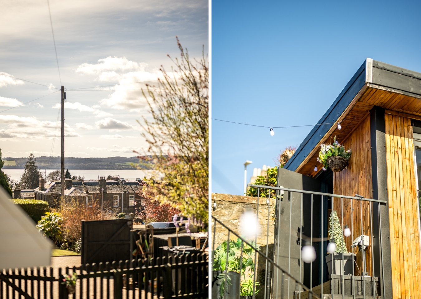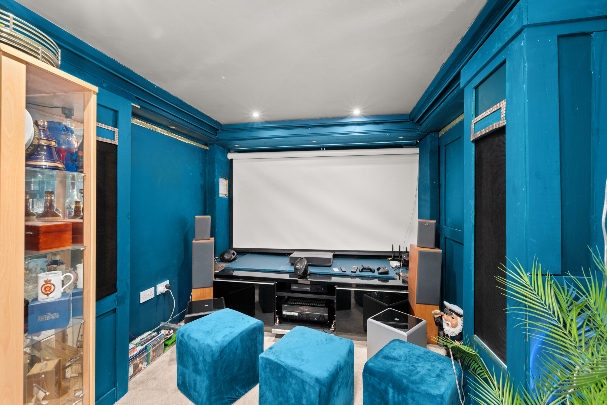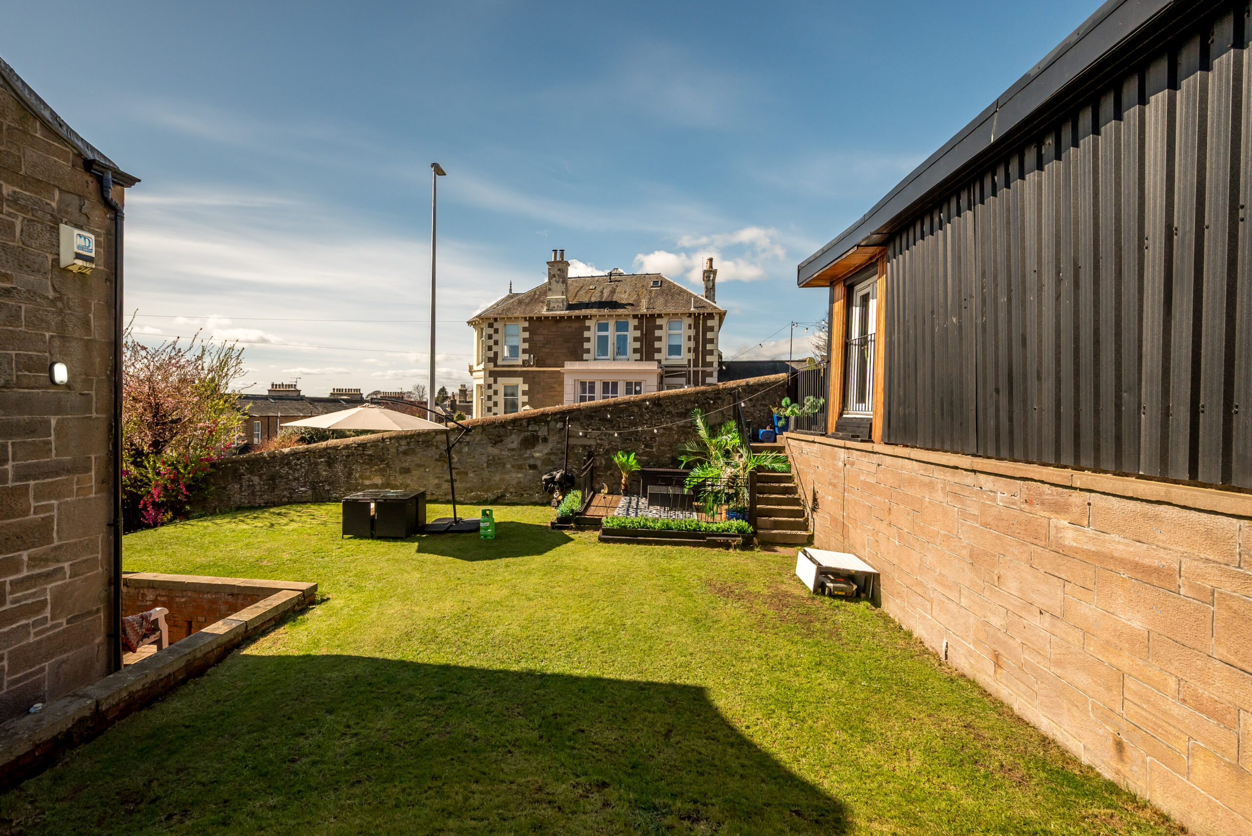 In the grounds, a substantial converted outbuilding clad in cedar and dark timber has been fitted out as a private entertainment space: curved bar, integrated lighting, projector and screen, finished to a standard well above what you'd expect from a garden building. A juliet balcony to the front looks back over the lawns and out towards the Tay. Separate from the main house, it works as a self-contained venue.