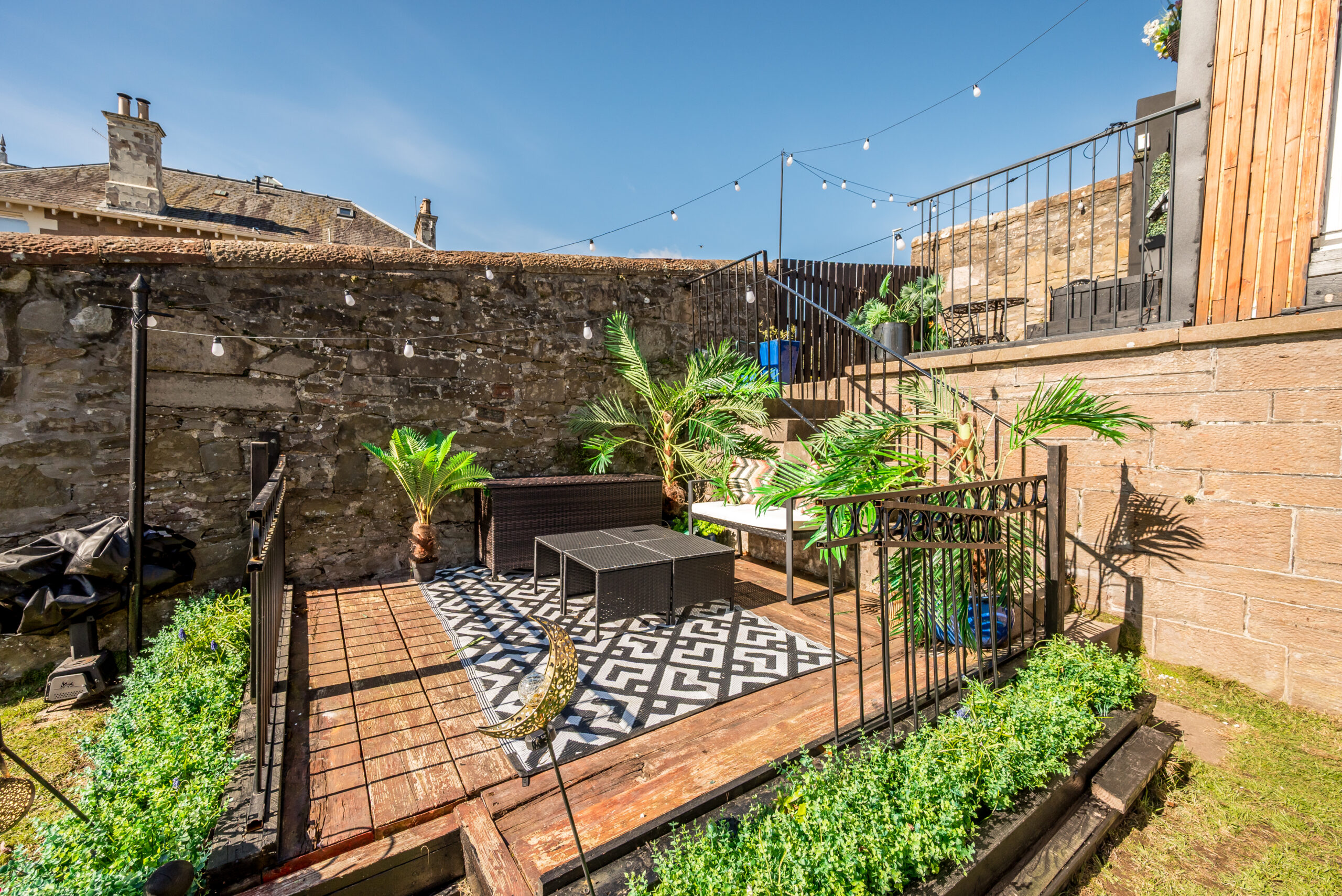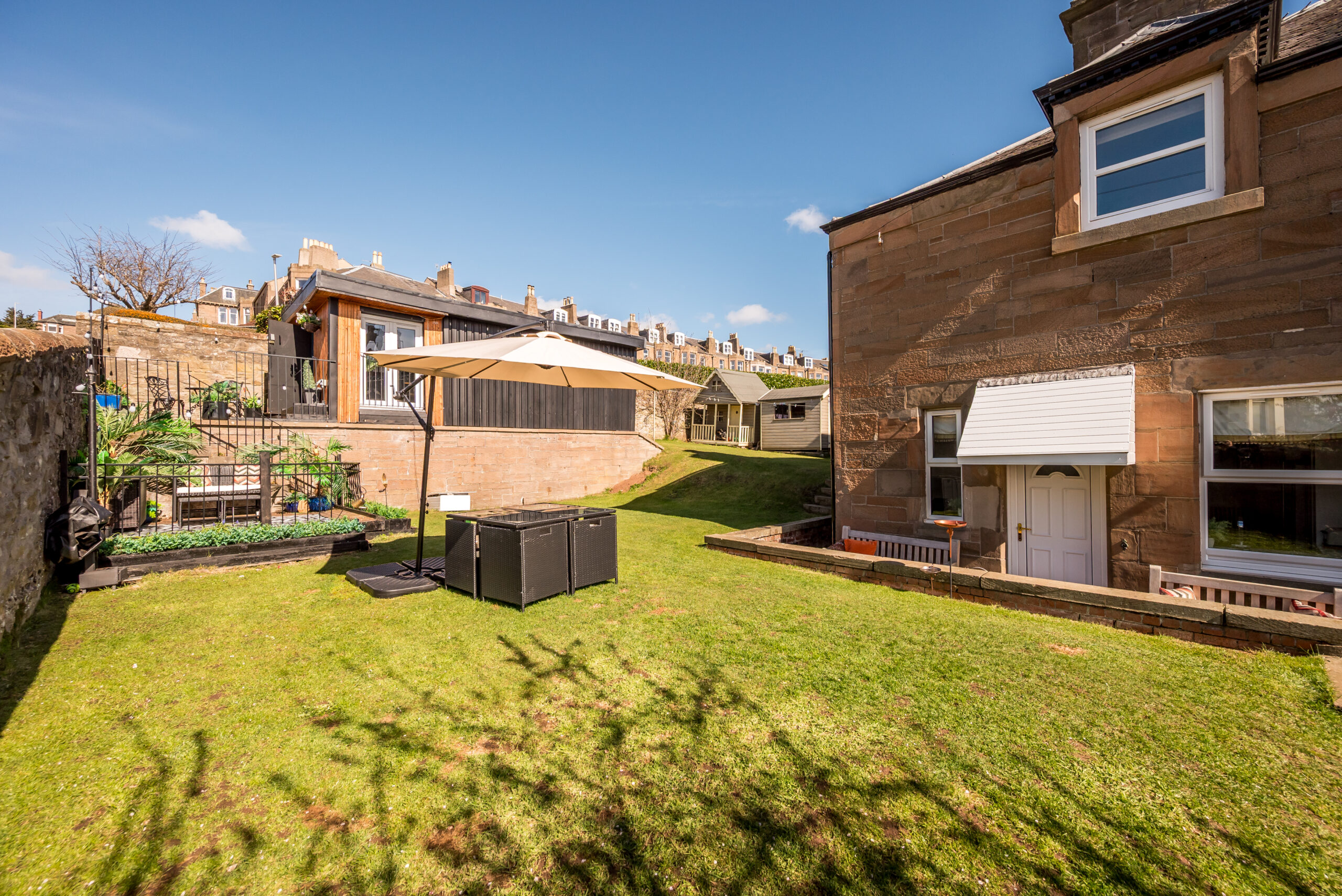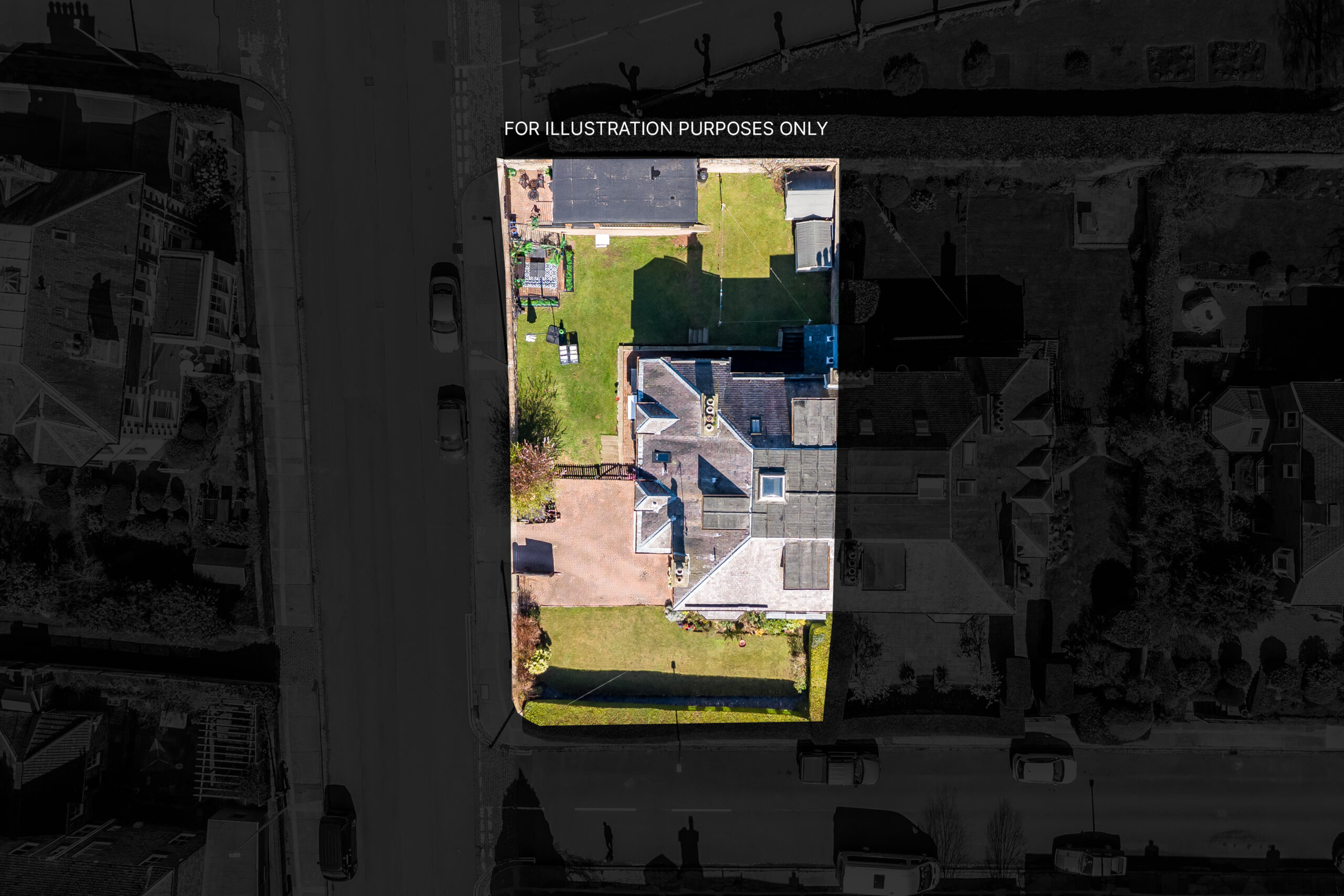 Well-kept lawns and planted borders extend around front, side and rear, alongside a lower terrace with festoon lighting and generous off-street parking to the front.