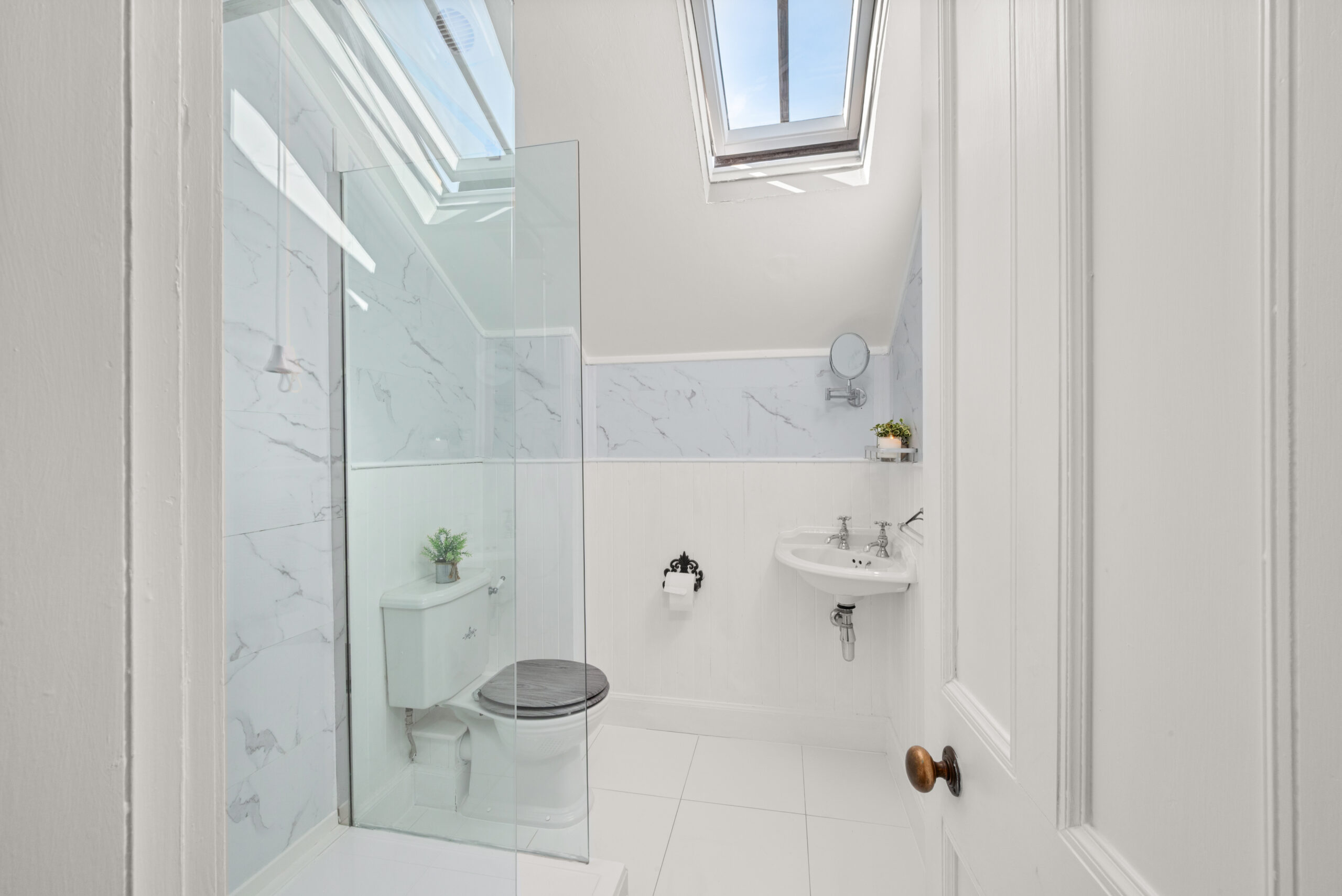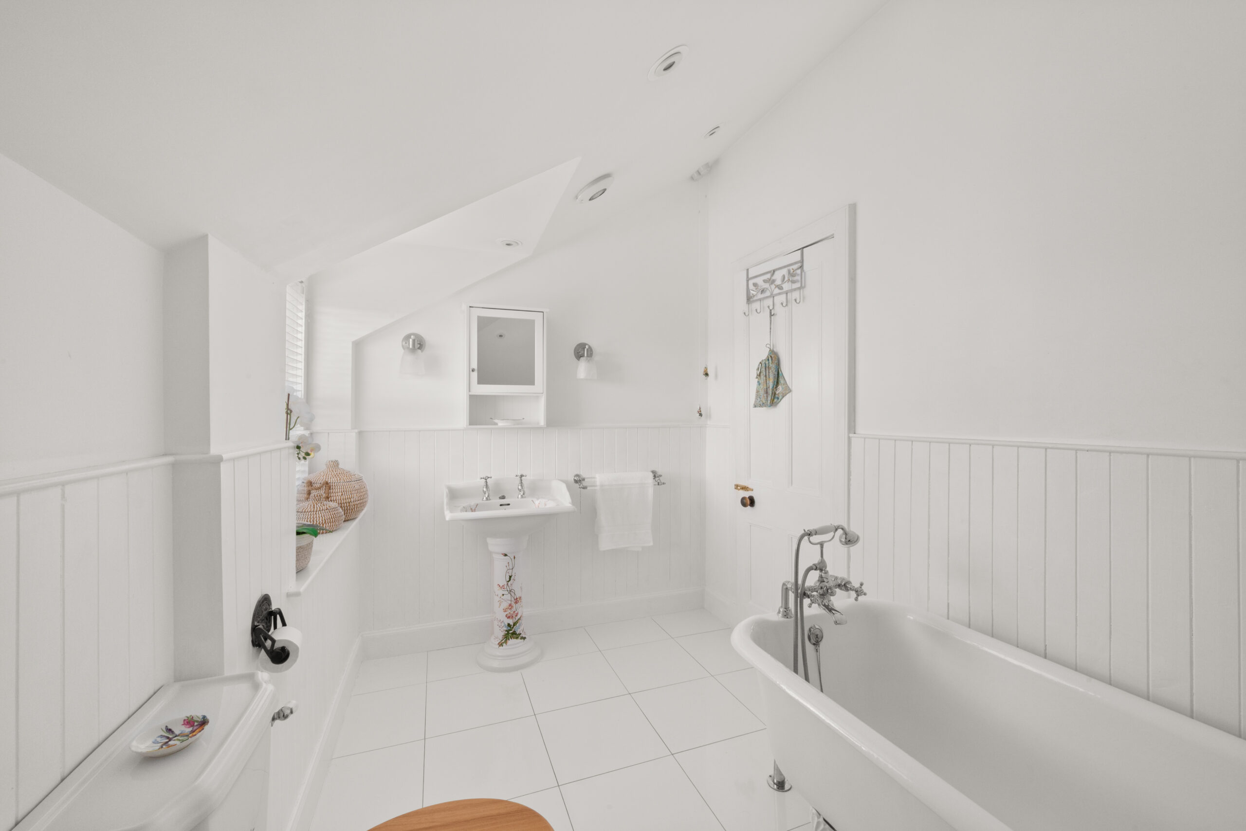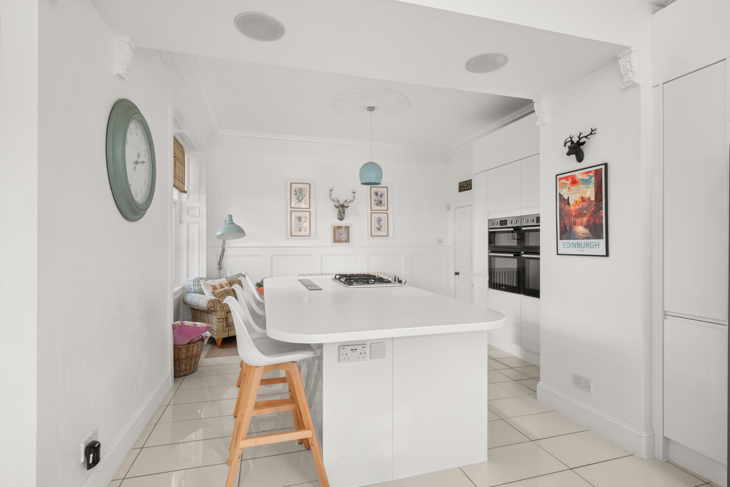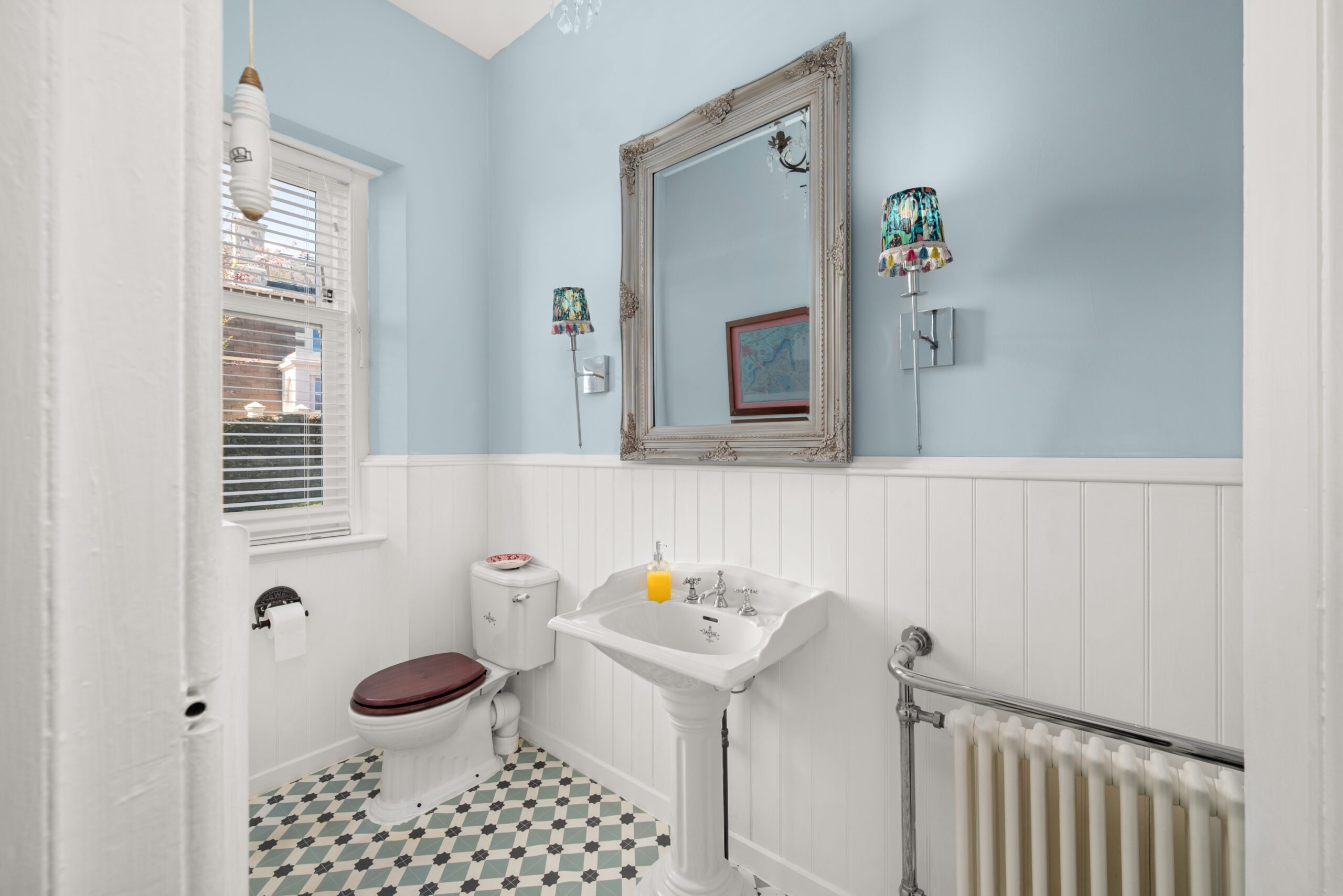 The reception rooms are exceptional. The bay-windowed sitting room has a built-in window seat, ornate cast iron fireplace and original tiled surround, a beautiful room with high ceilings and original plasterwork carefully preserved. A formal living room, generous dining room and cloakroom complete the ground floor.
