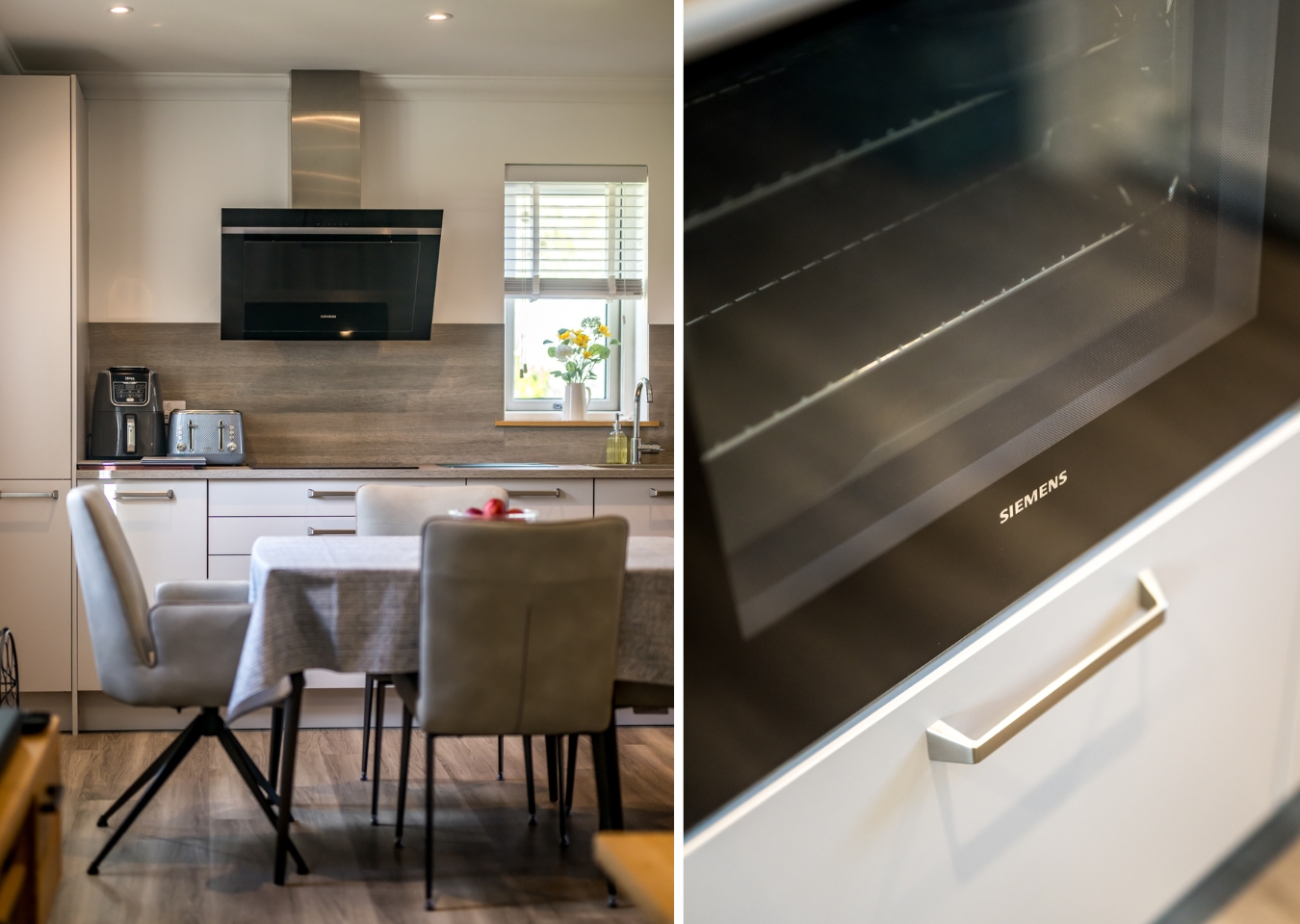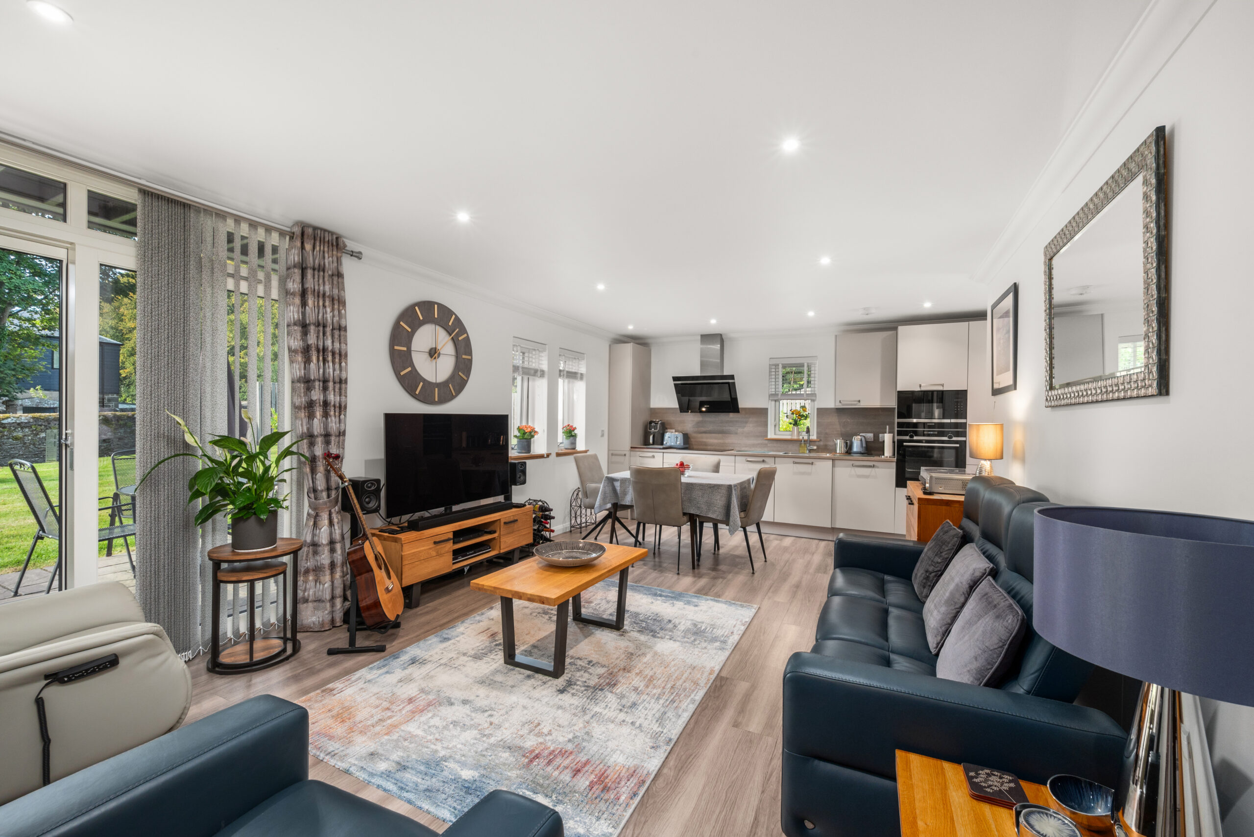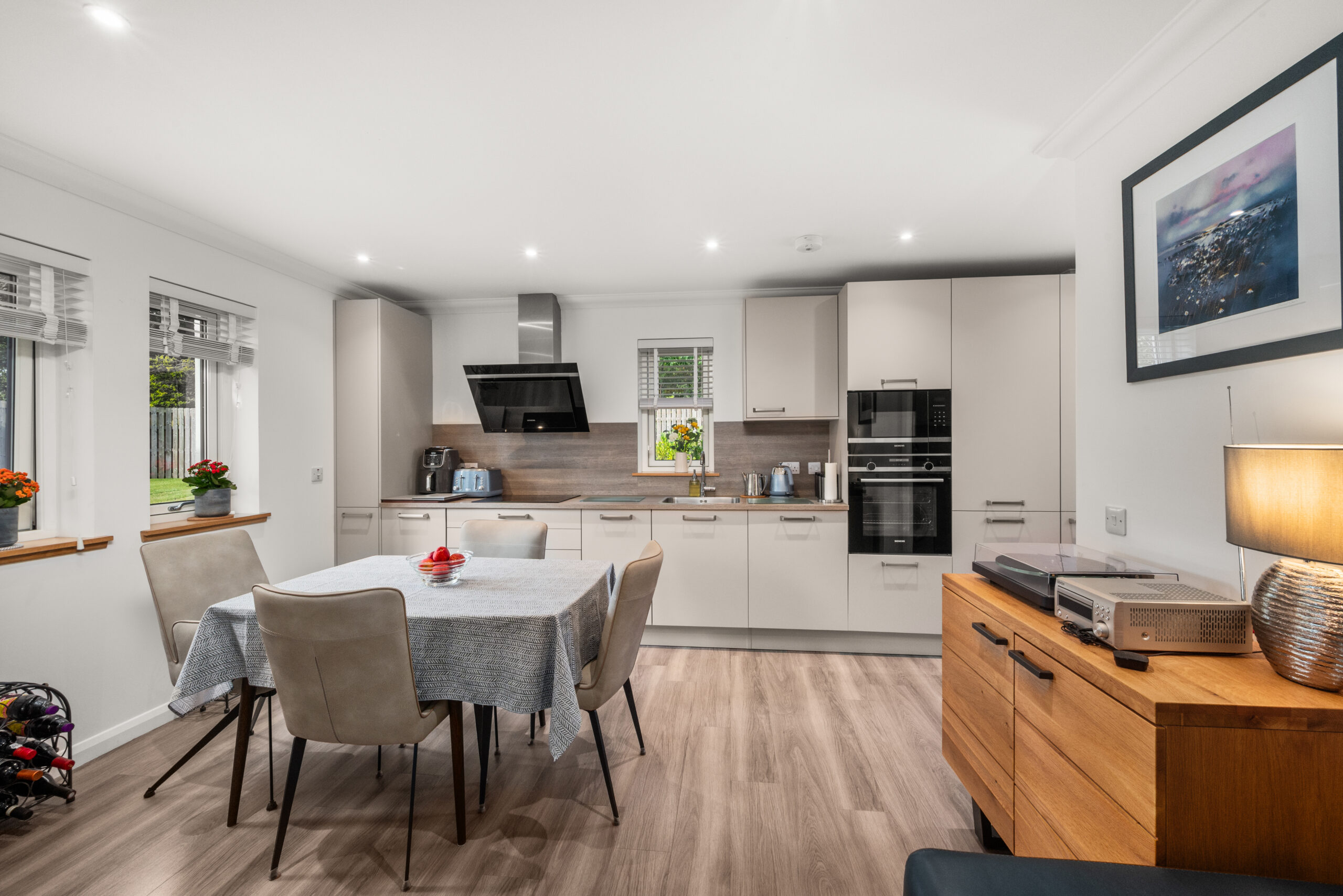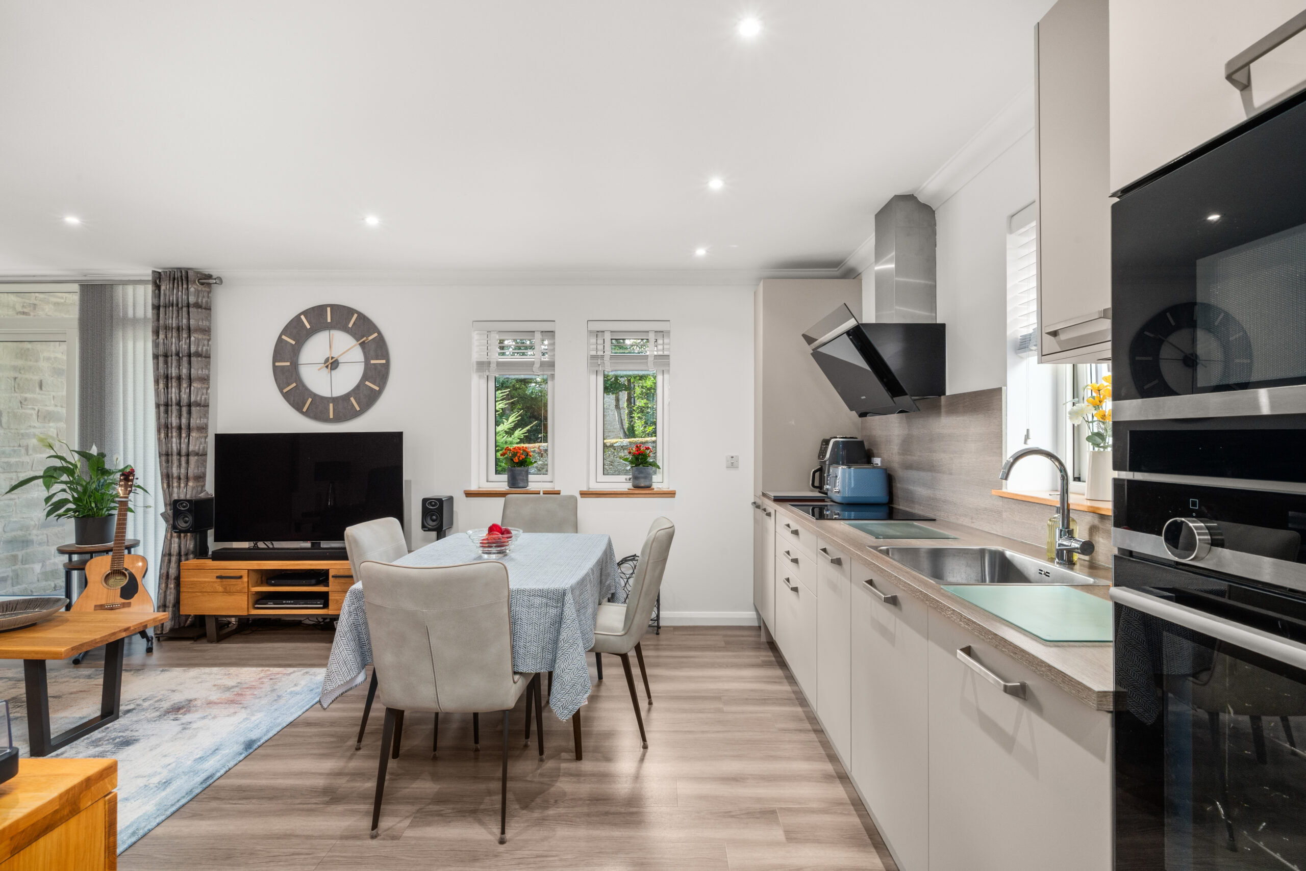 At the heart of the home is a generous open-plan kitchen/dining/living room, finished in a sleek, contemporary style with clean-lined cabinetry, integrated appliances and plenty of space to relax and entertain. Patio doors open straight out to your private patio, creating a natural extension to the living space - perfect for a morning coffee, a quiet read, or summer evenings with friends, while the surrounding grounds remain predominantly open-plan and communal.