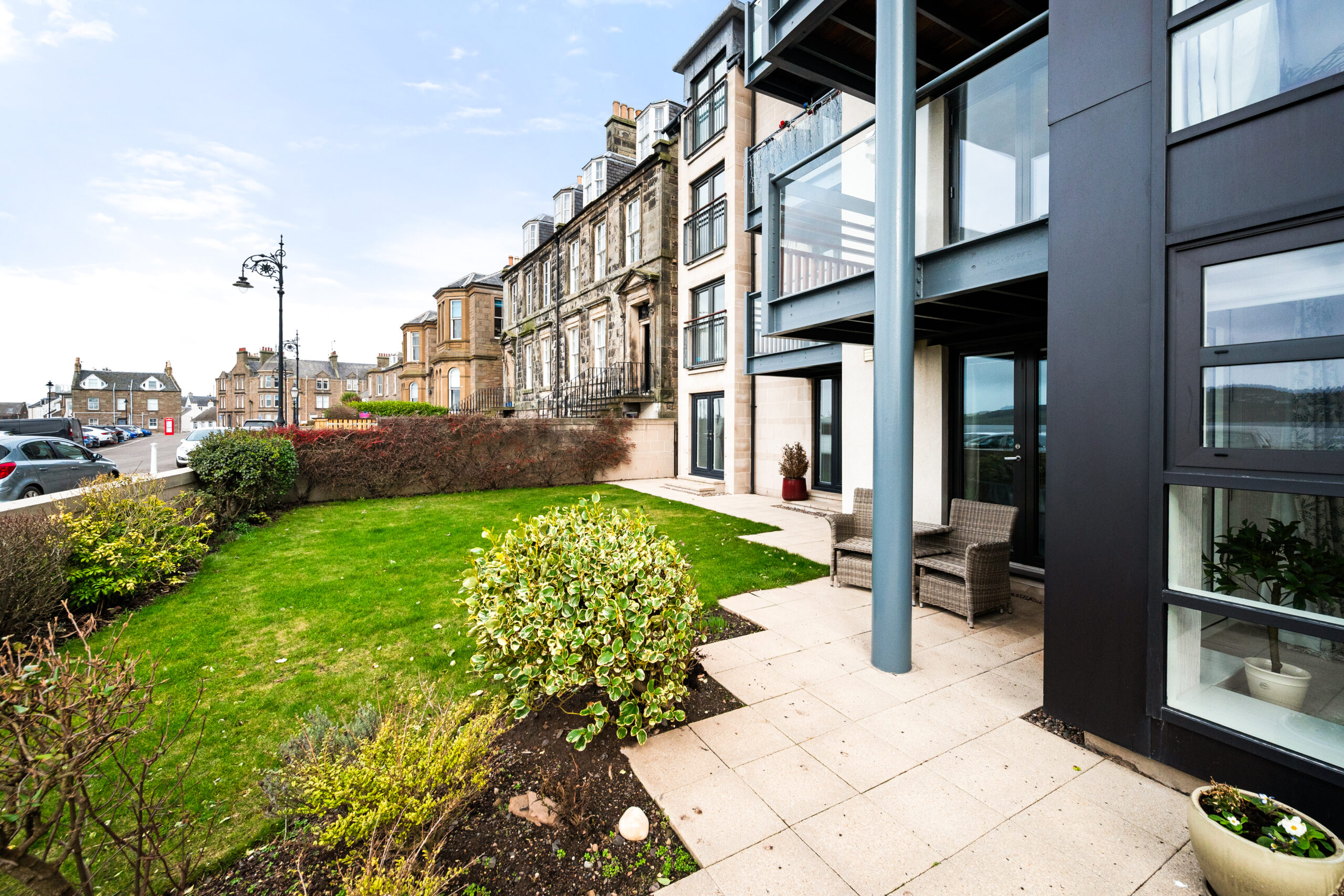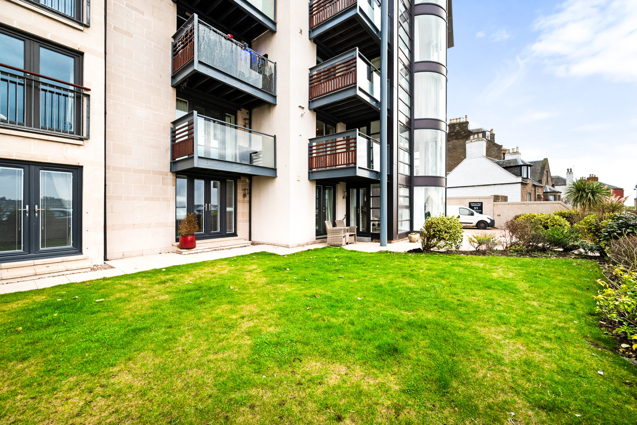 Harbour View Apartments, 51a Beach Crescent, occupies a standout position on the waterfront, in one of the Ferry’s most instantly recognisable modern developments. The building’s mono-pitched roofline and distinctive oriel-style glazing give it a strong architectural presence on Beach Crescent, while the setting delivers the lifestyle: promenade walks on the doorstep, the water always in view, and Broughty Ferry’s main shopping streets close enough for day-to-day ease.
