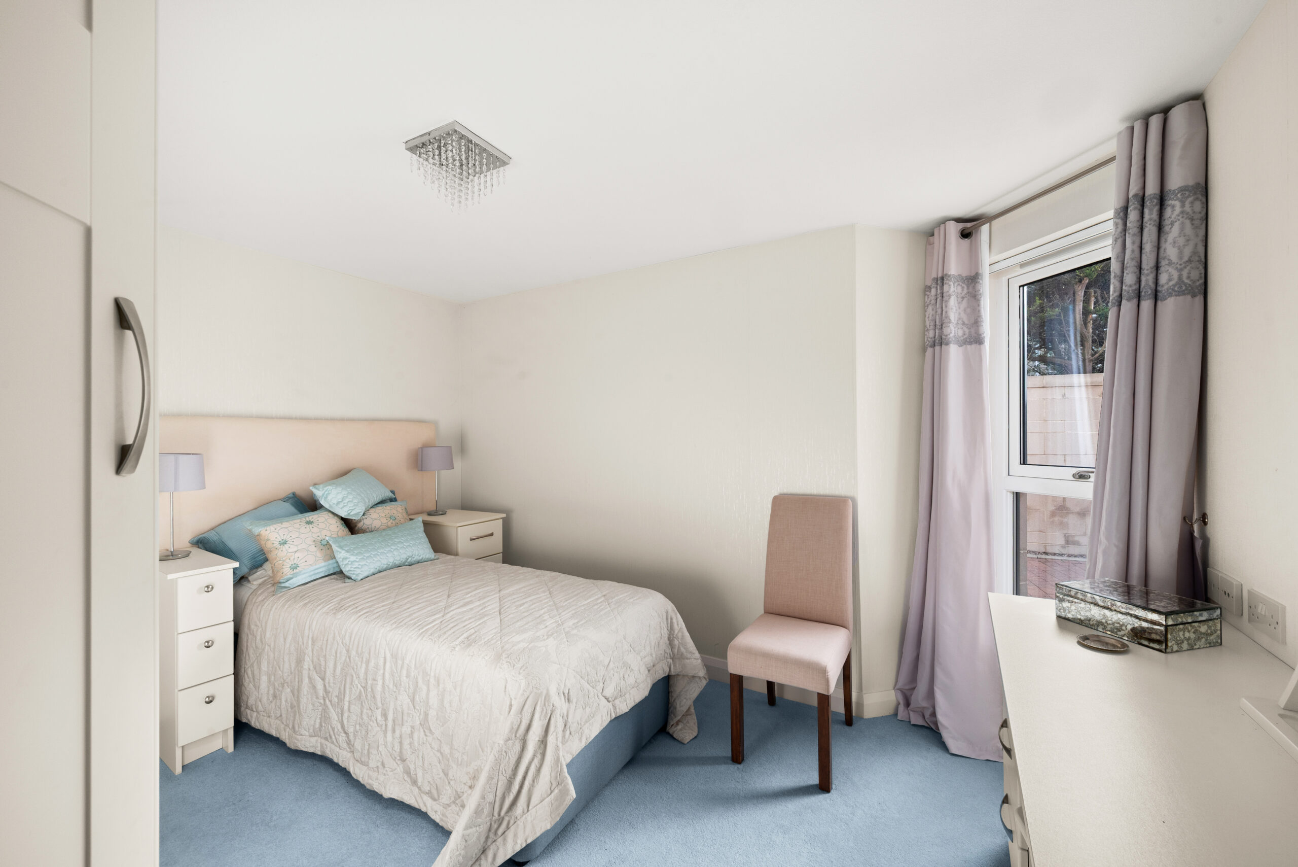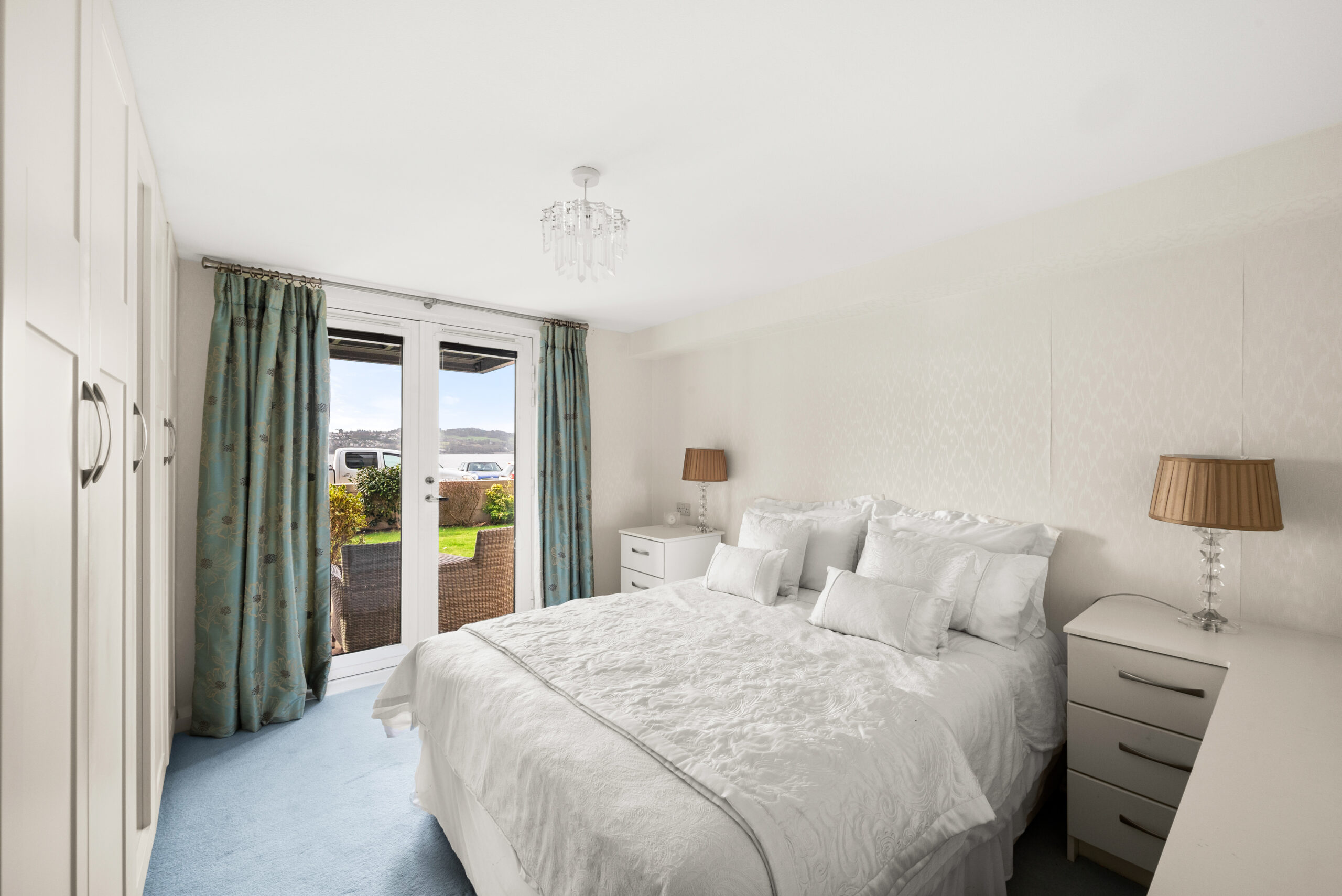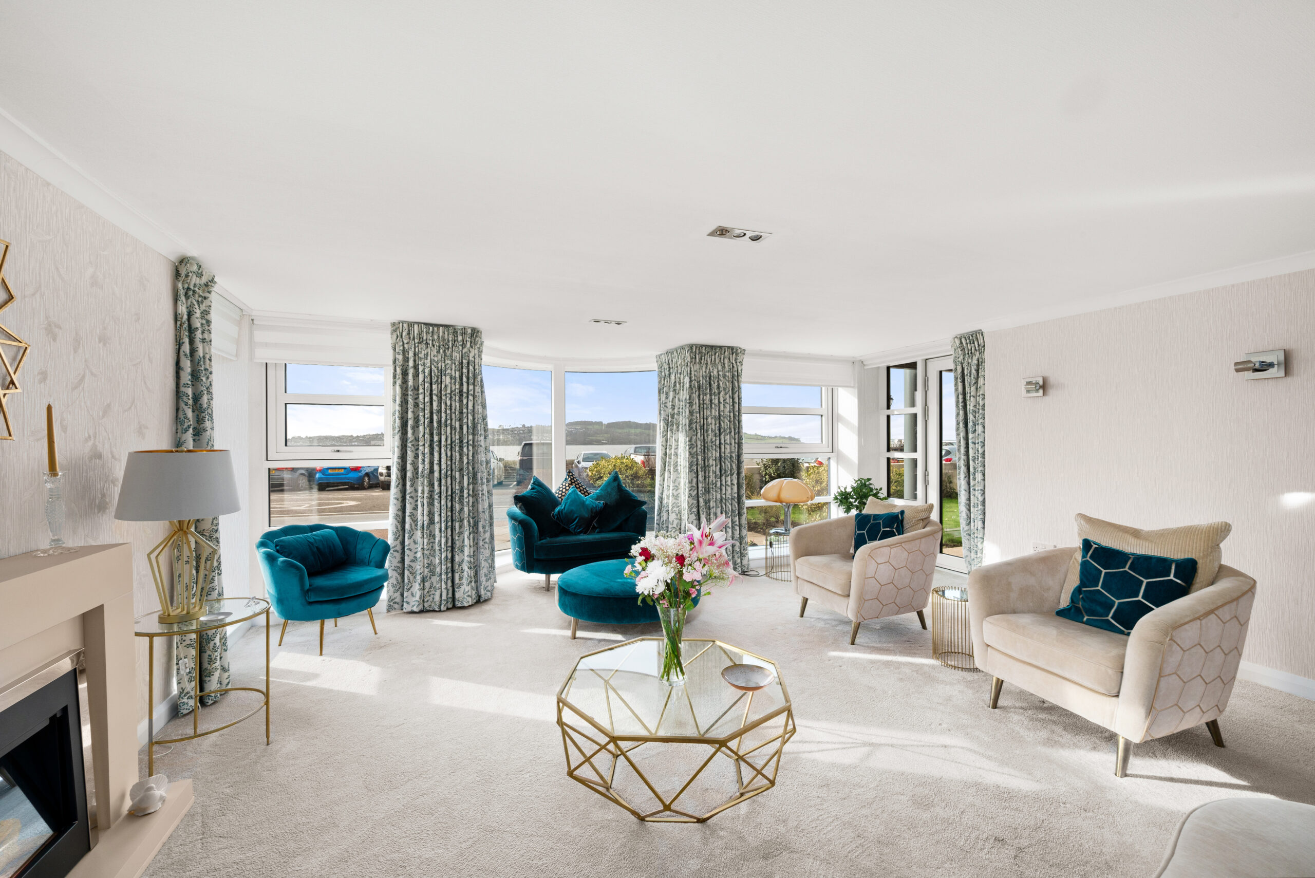 The apartment itself has been kept impeccably and is designed for straightforward living. There is step-free access via the well-presented communal hall, with an additional level route via the patio doors from the lounge onto the front terrace. Inside, the lounge is a superb space, bright, generously proportioned, and arranged to make the most of the outlook. Those patio doors open directly onto a private terrace set within beautifully maintained, factor-kept gardens, creating an easy outdoor extension of the living space with the waterfront beyond.