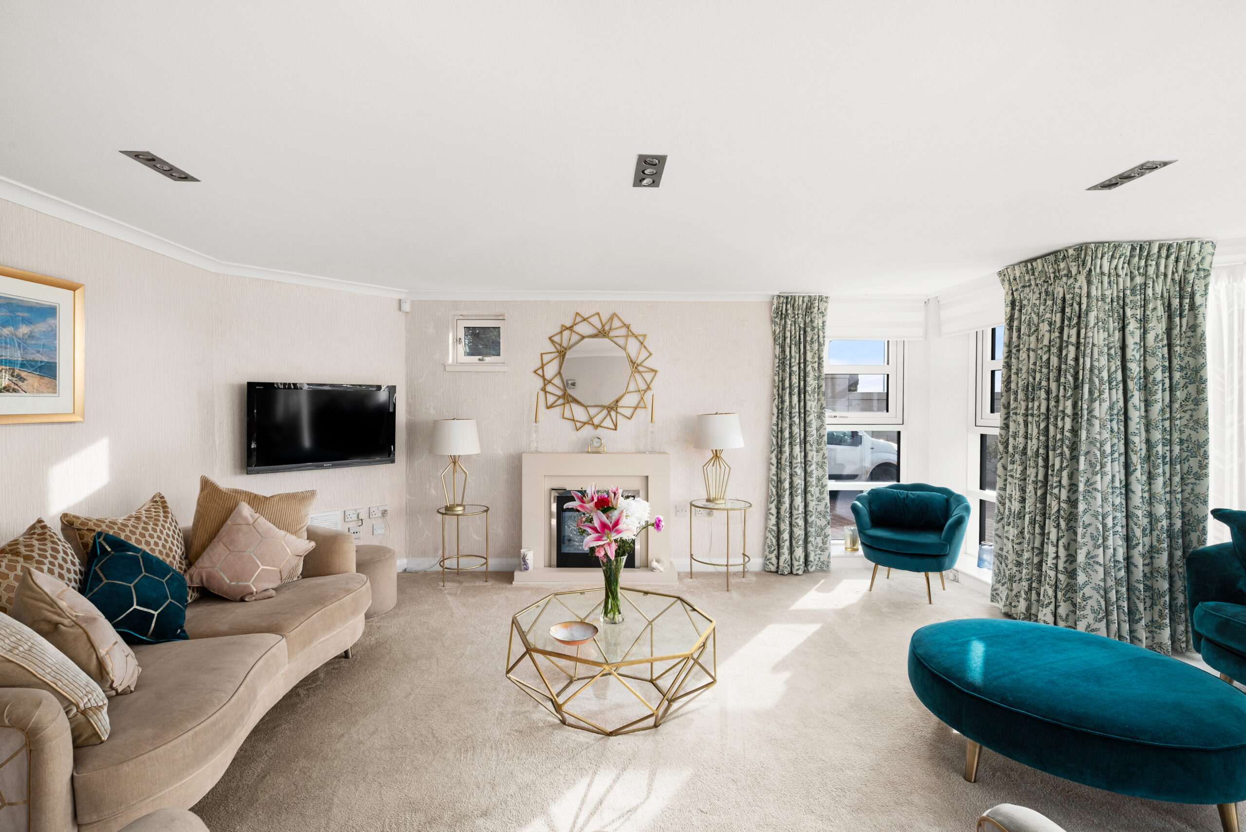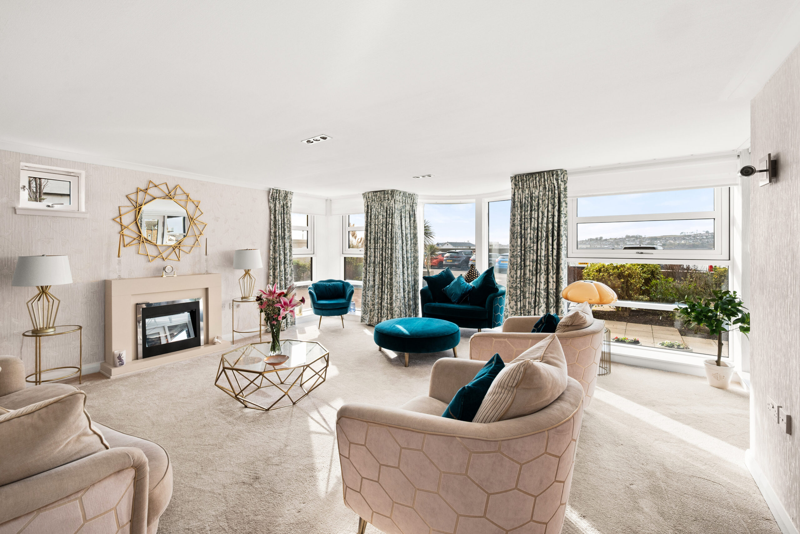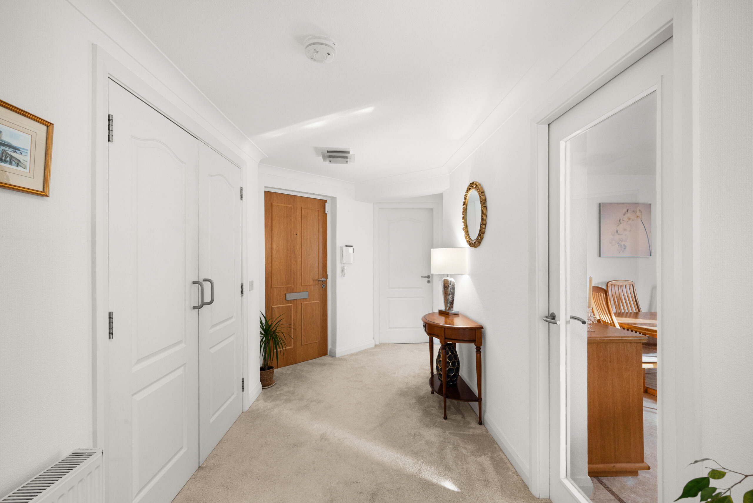 The apartment itself has been kept impeccably and is designed for straightforward living. There is step-free access via the well-presented communal hall, with an additional level route via the patio doors from the lounge onto the front terrace. Inside, the lounge is a superb space, bright, generously proportioned, and arranged to make the most of the outlook. Those patio doors open directly onto a private terrace set within beautifully maintained, factor-kept gardens, creating an easy outdoor extension of the living space with the waterfront beyond.