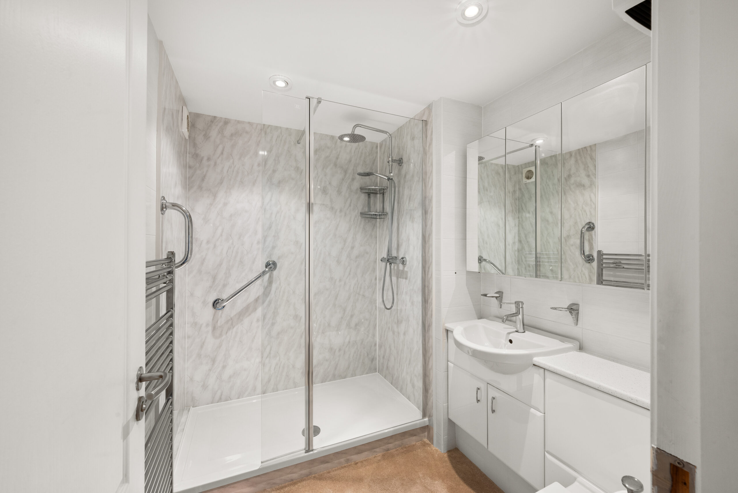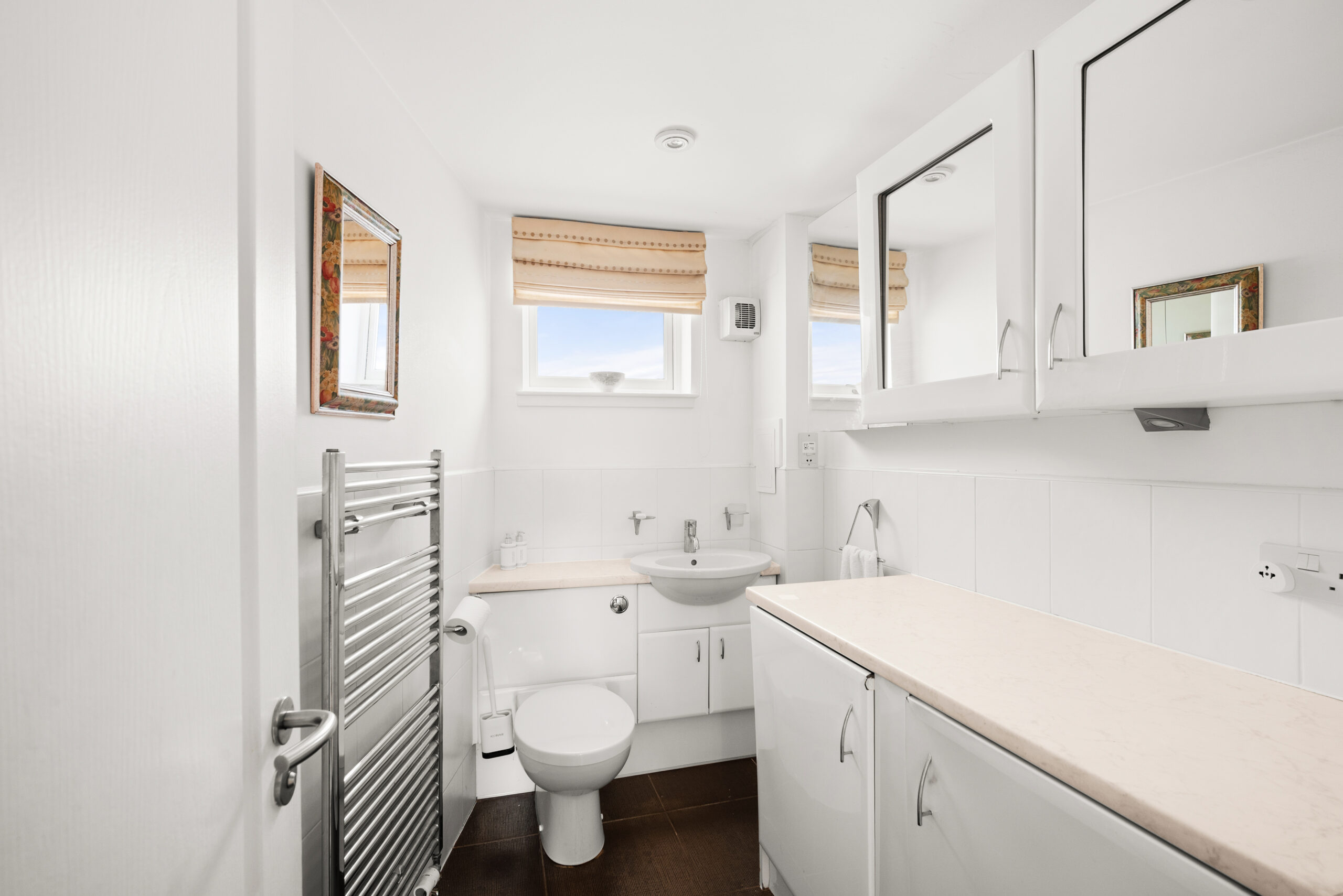 A separate kitchen/diner provides excellent room for cooking and eating, finished with contemporary cabinetry and integrated appliances. Two true double bedrooms offer flexibility for guests or home working, each supported by excellent storage, while the layout is completed by a separate WC and a modern shower room, a quietly useful detail that makes everyday routines smoother.