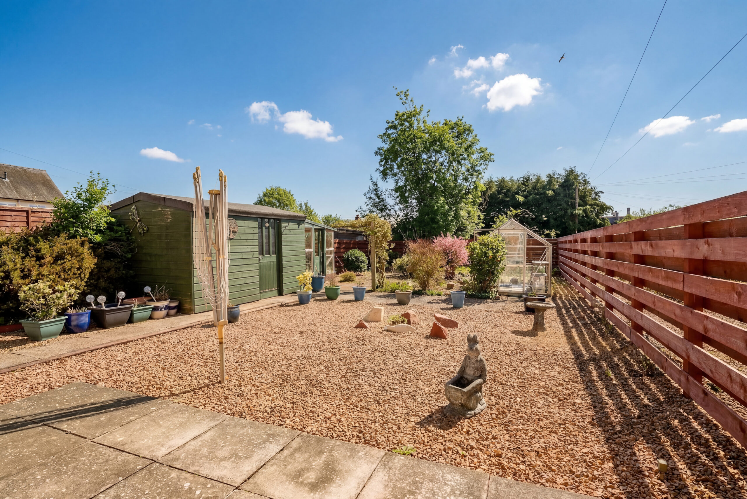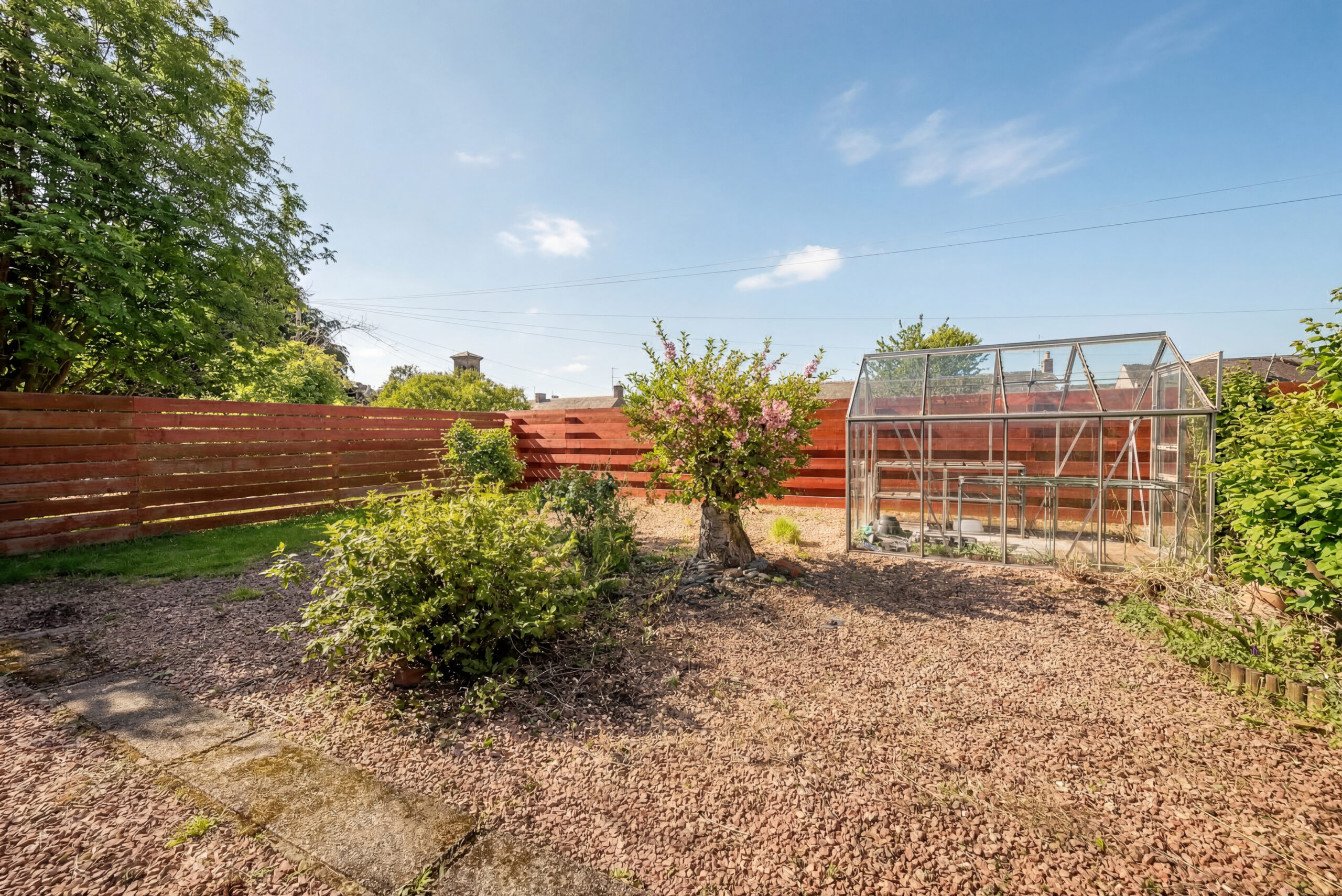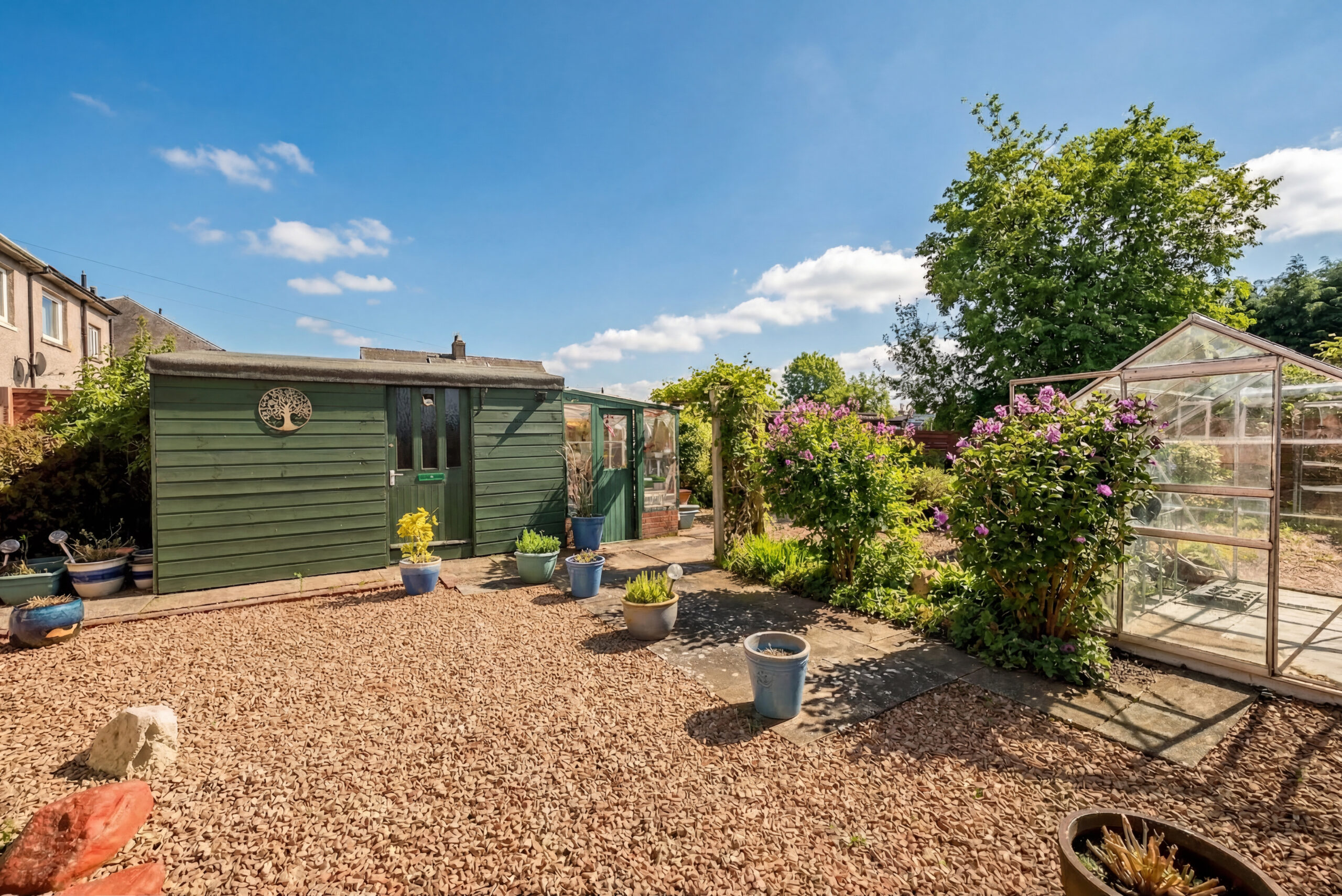 Outside, the rear garden is a real feature of the home. It is neatly arranged with a mix of lawn, chipped and planted areas, creating a lovely space to enjoy through the warmer months. The greenhouse and garden shed add further practicality, and the driveway to the front and side provides convenient off-street parking.