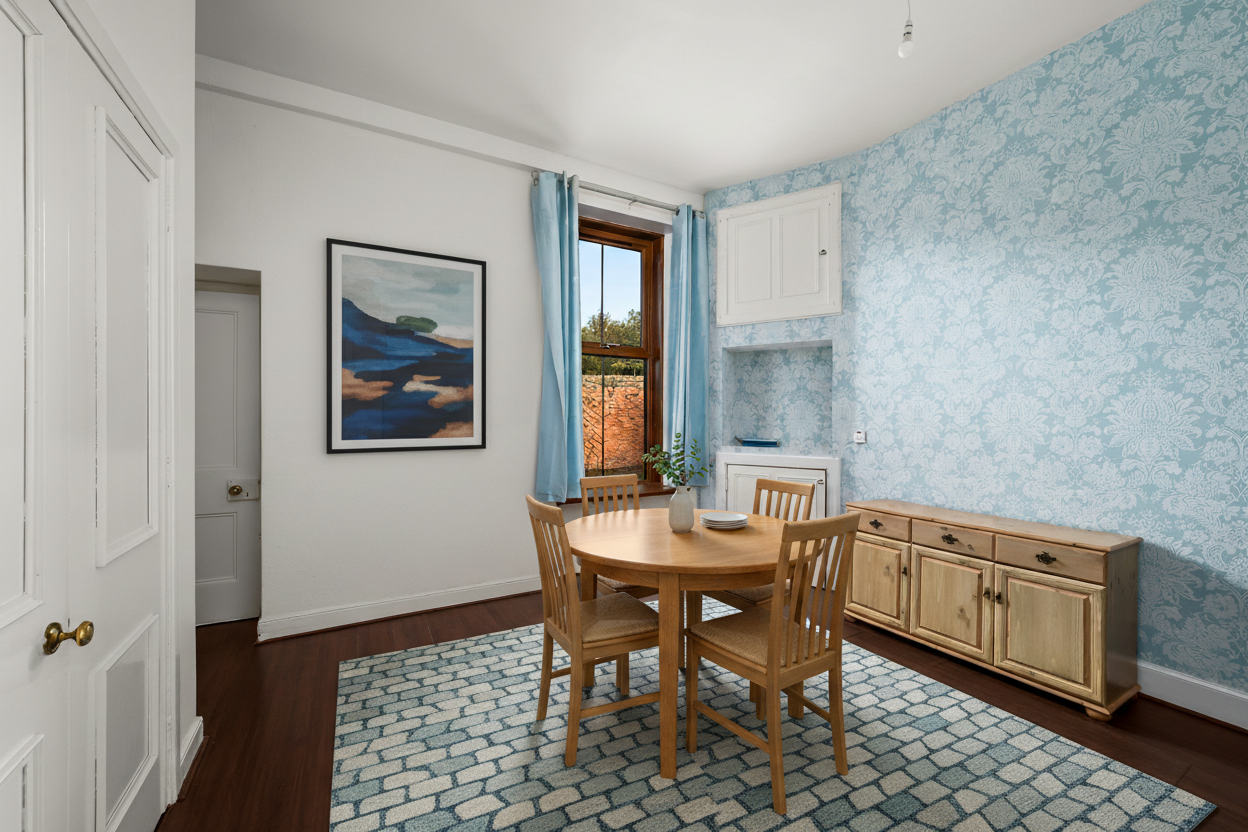 Inside, a welcoming hallway leads to a bright, spacious lounge where original features like cornicing, wood panelling, and a feature fireplace add warmth and charm. The generous dining room is ideal for entertaining or everyday family life, while the kitchen at the rear offers ample space and access to the private courtyard. A ground-floor shower room and useful storage areas make for a very practical layout.