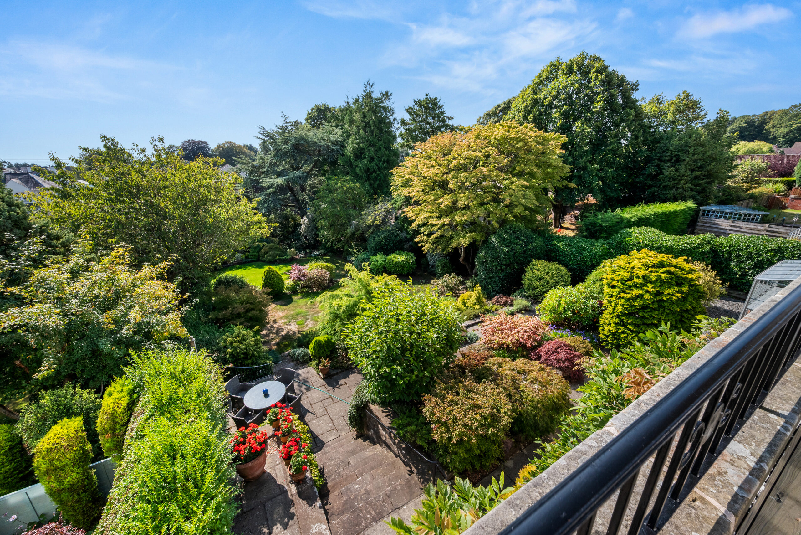 The upper floors provide four bedrooms, with flexibility for a fifth if required which could also be utilised as an excellent home office space. The principal bedroom is particularly noteworthy, opening onto a balcony that overlooks the gardens – a private place to enjoy the changing seasons. Three bathrooms, one on each level, together with a sauna, complete the accommodation.