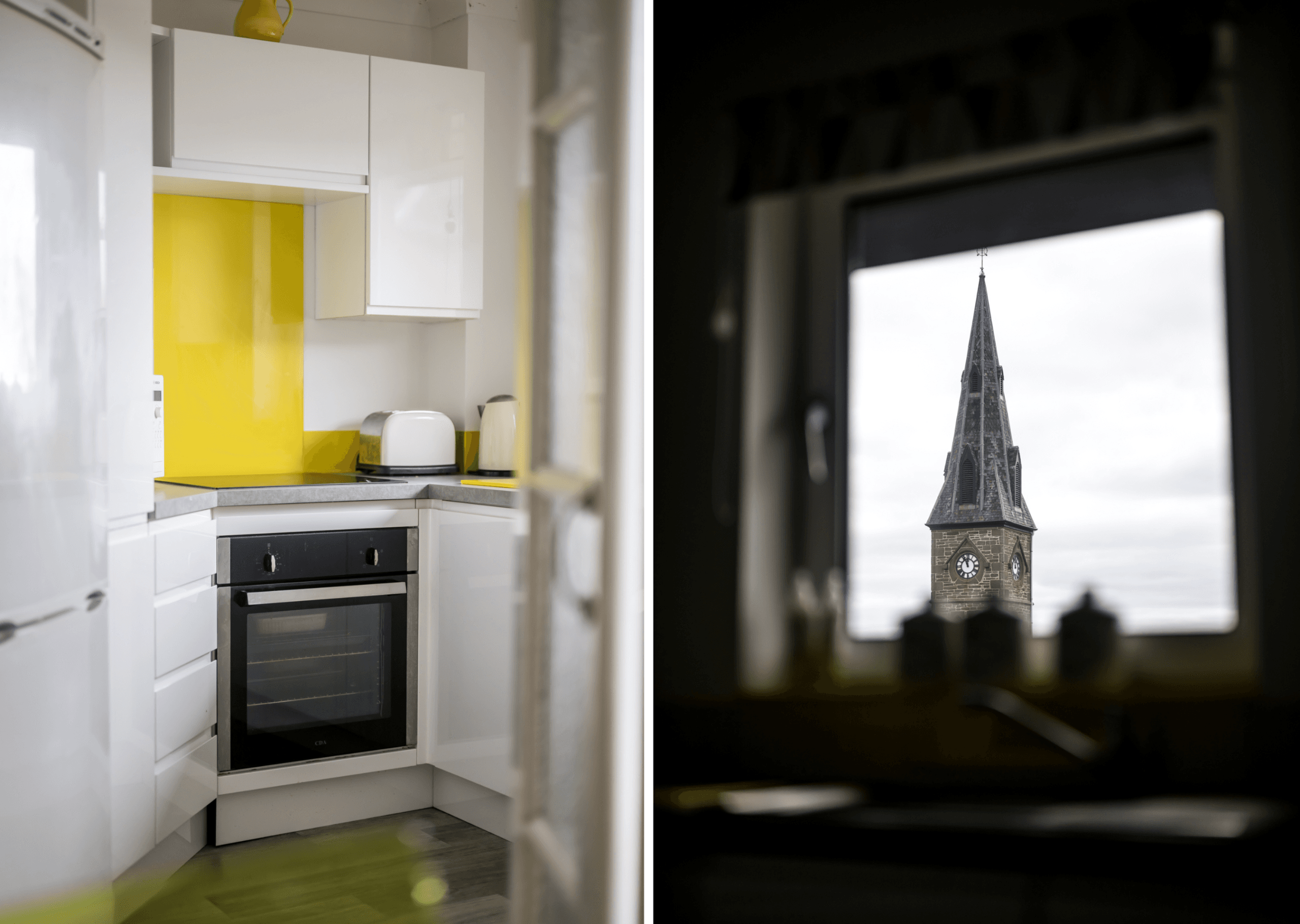 Both bedrooms are comfortable doubles, each with fitted wardrobes and a peaceful outlook across the town. The shower room is designed with ease of access in mind, and practical features include double glazing, electric heating, and lift access to all floors.