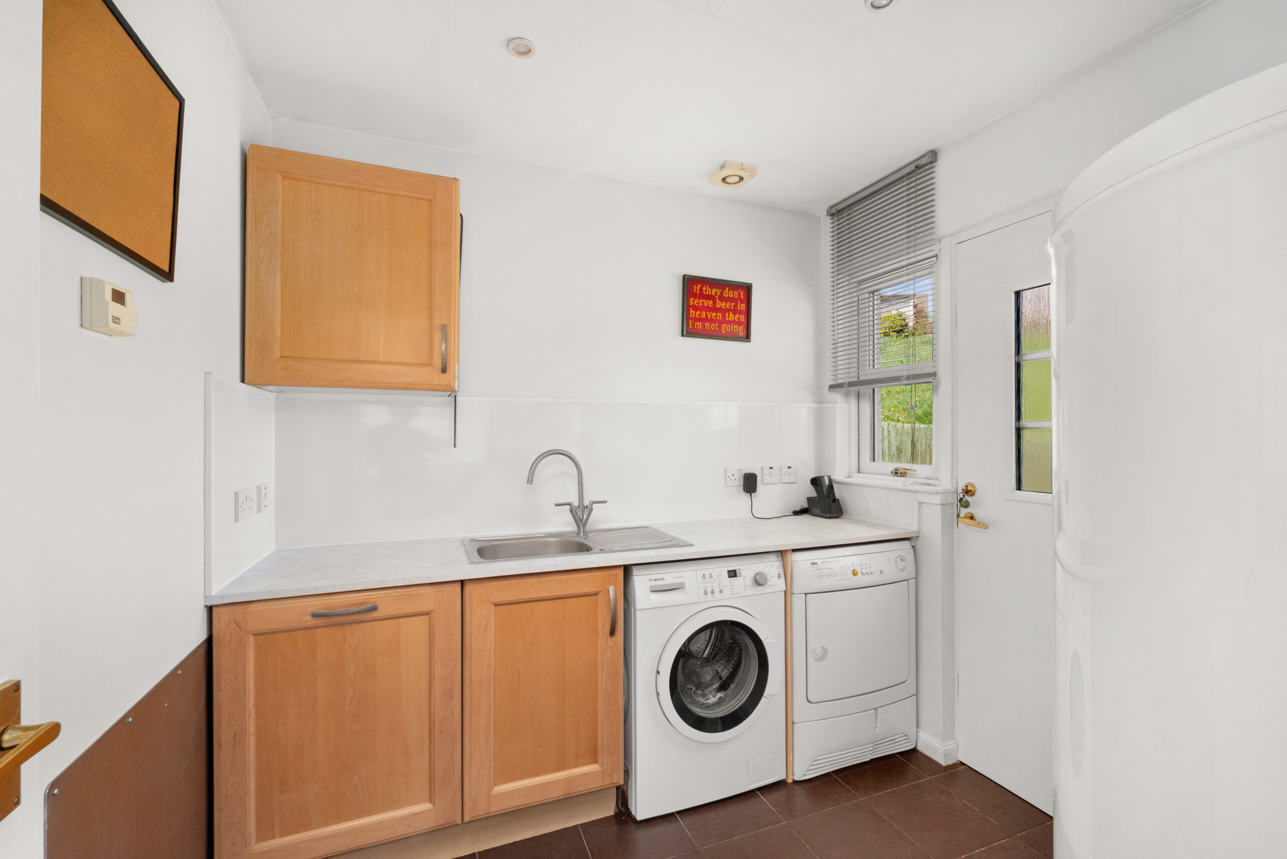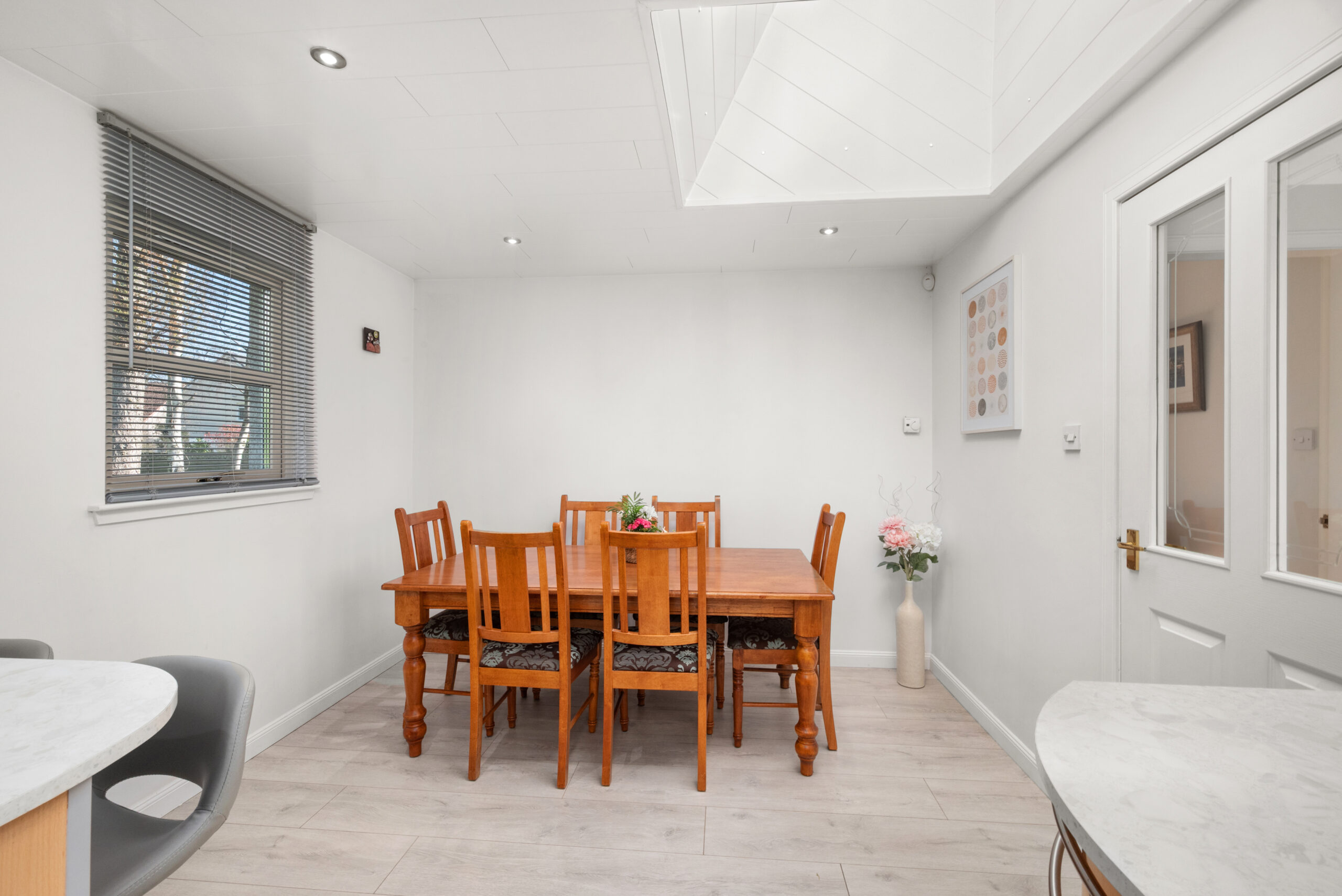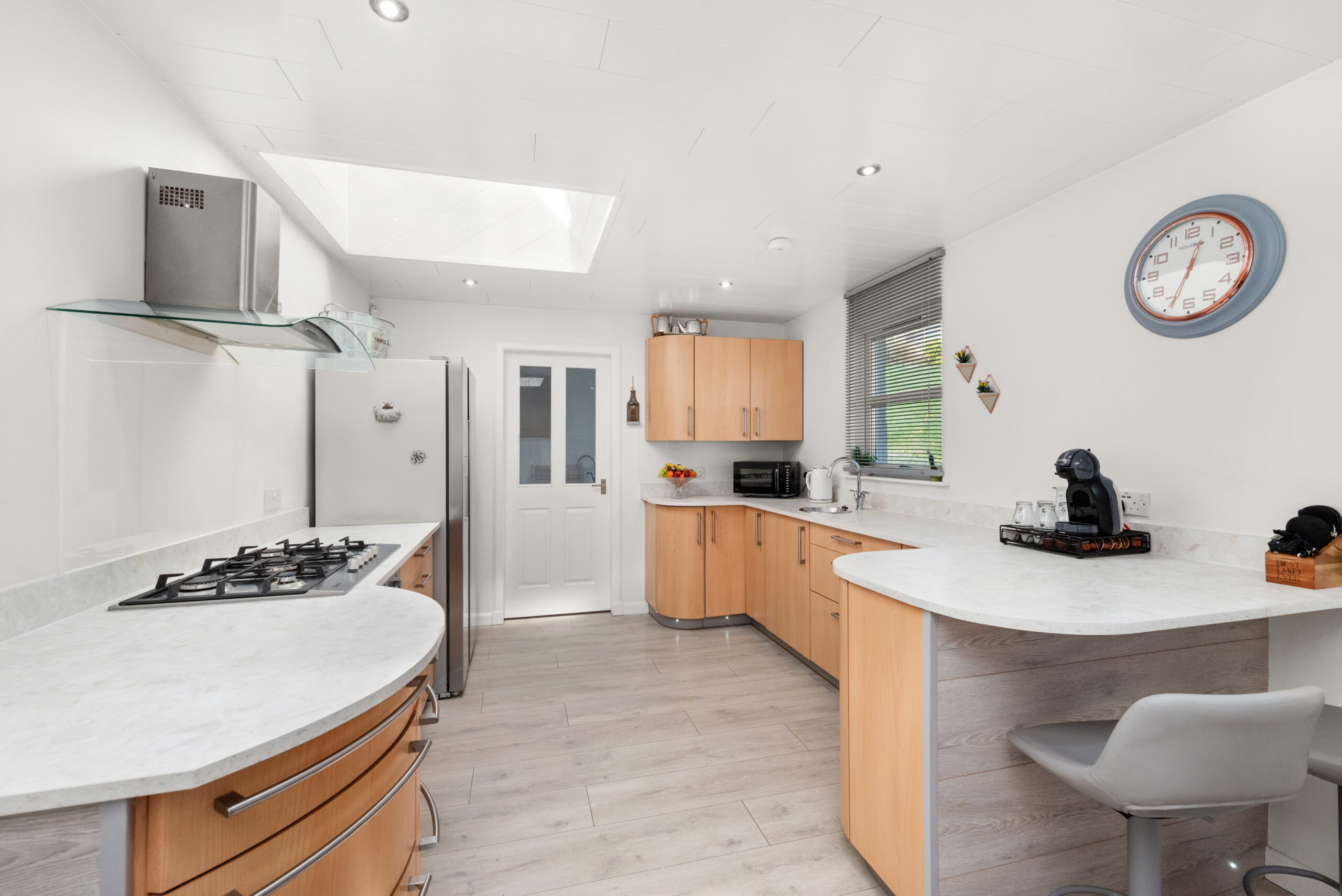 The layout is both spacious and versatile, making it equally appealing as a refined family home or an exceptional option for those seeking generous level living. The lounge is a particularly elegant and welcoming room, with a wood-burning stove creating a natural focal point and doors opening onto the terrace. The kitchen/dining room is bright, contemporary and well designed, with excellent worktop space and a breakfast bar, while a practical utility room adds everyday convenience and provides direct access to the rear garden. A separate sitting room offers further flexibility as an additional public room, home office or fourth bedroom if required.