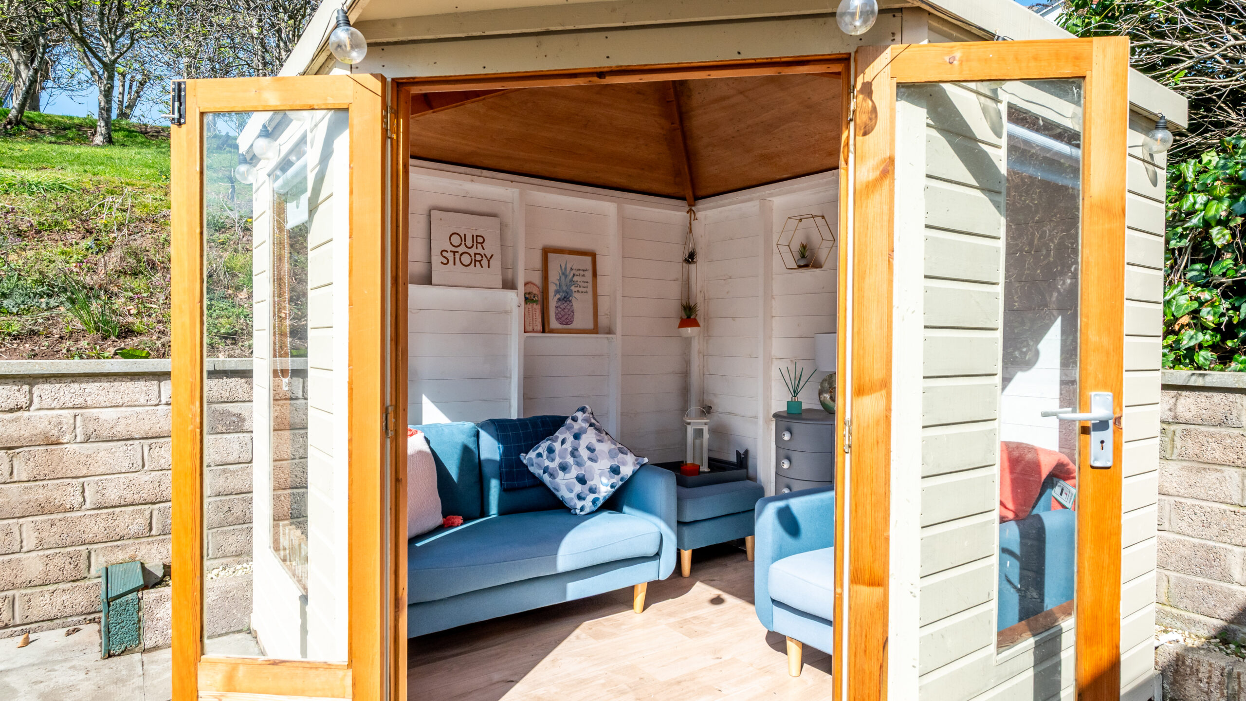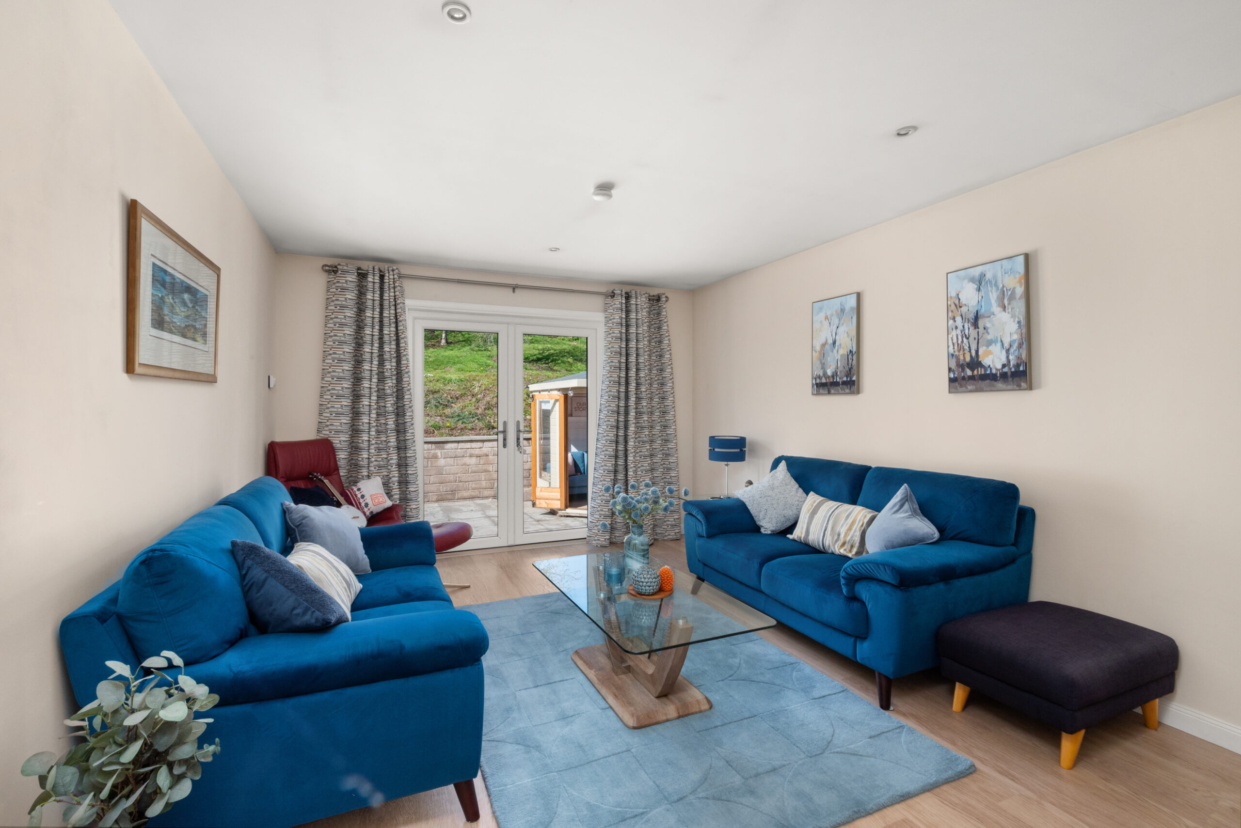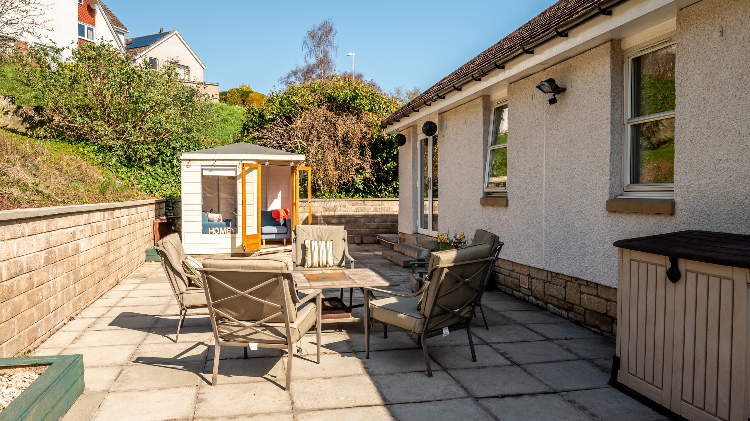 Outside, the south-facing terrace is a standout feature, complemented by a raised deck and beautifully kept gardens that make the most of the generous plot. The summer house, with power and light, adds a useful extra space to the garden. A detached garage with power and light, external store sheds and useful loft storage add further practicality.