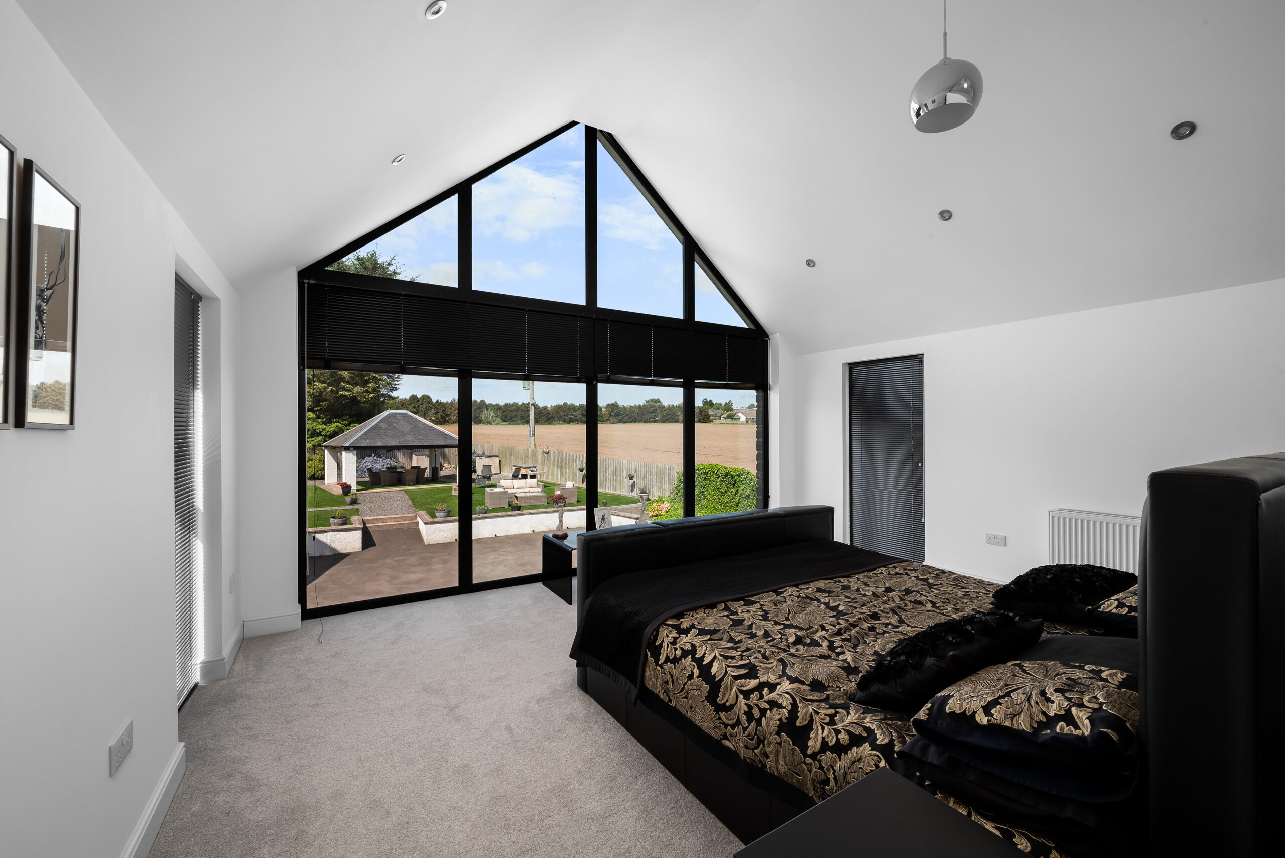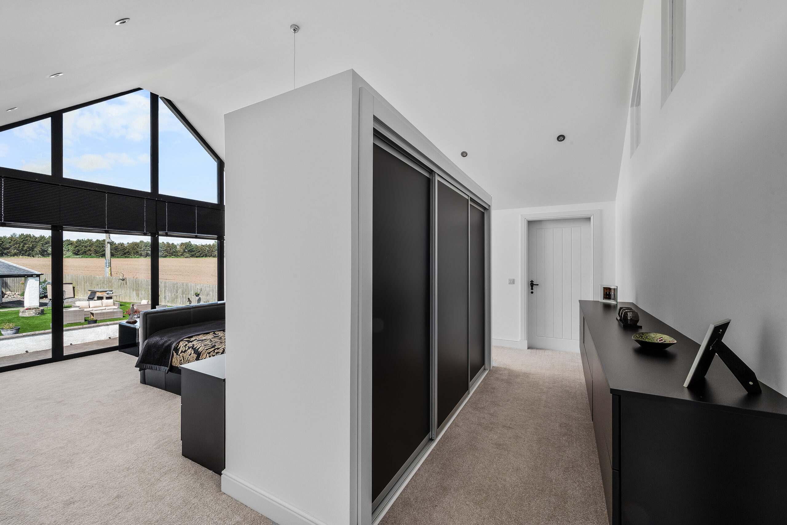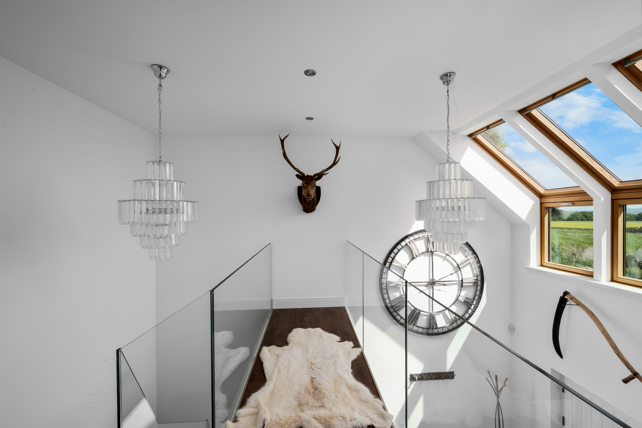 Upstairs, the fully glass-panelled landing introduces a show-stopping lounge and bar—where vaulted ceilings and a dramatic wall of glazing frame sweeping countryside views. This space, complete with a dedicated bar area, offers the perfect setting for entertaining or unwinding in style.