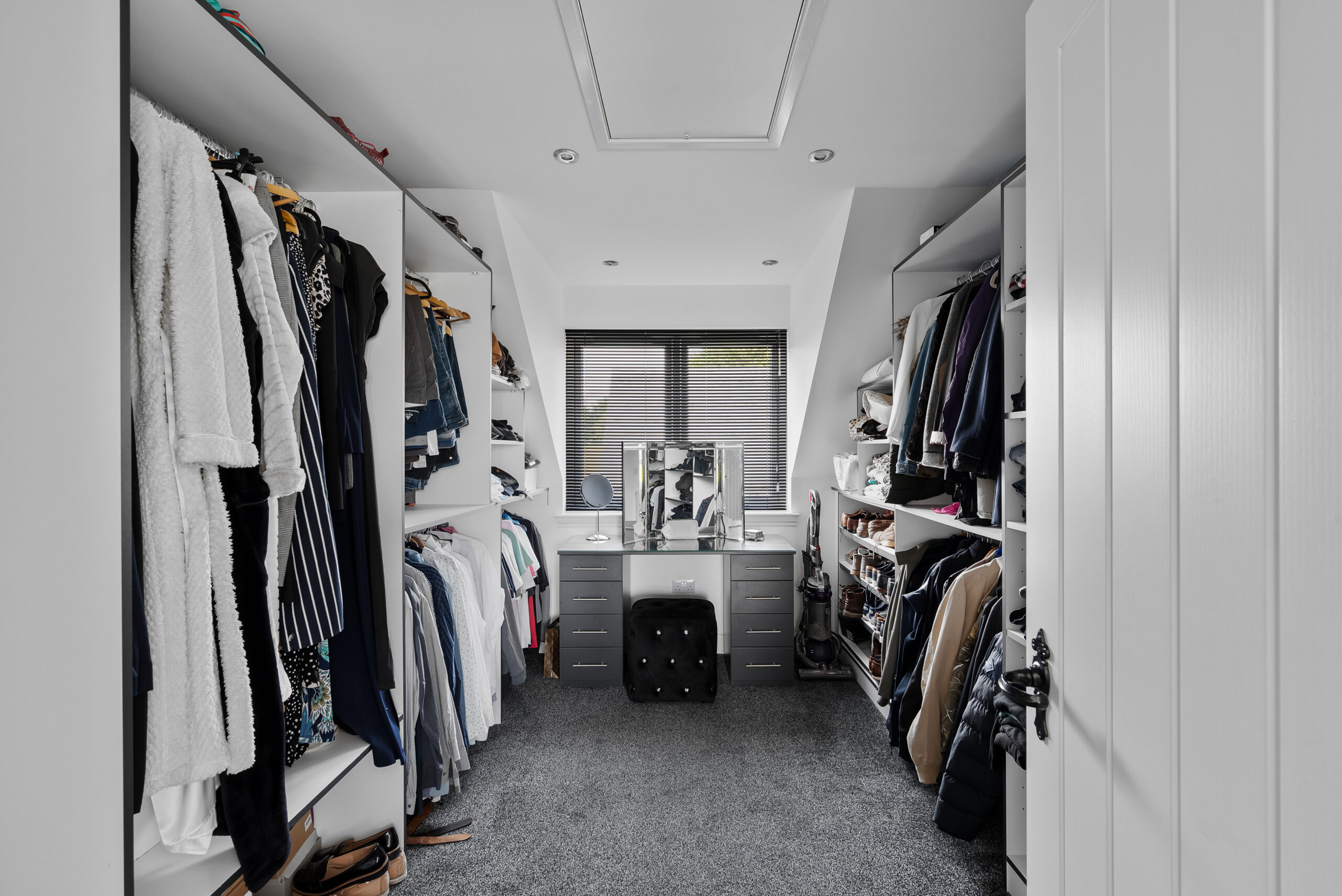 Accommodation is generous and flexible, with four double bedrooms across two floors. On the ground floor, two bedrooms are served by a stylish Jack and Jill bathroom—ideal for guests, teenagers, or multigenerational living. Upstairs, both bedrooms feature en-suites; one with a spacious dressing room, the other with expansive windows overlooking the landscaped rear garden.