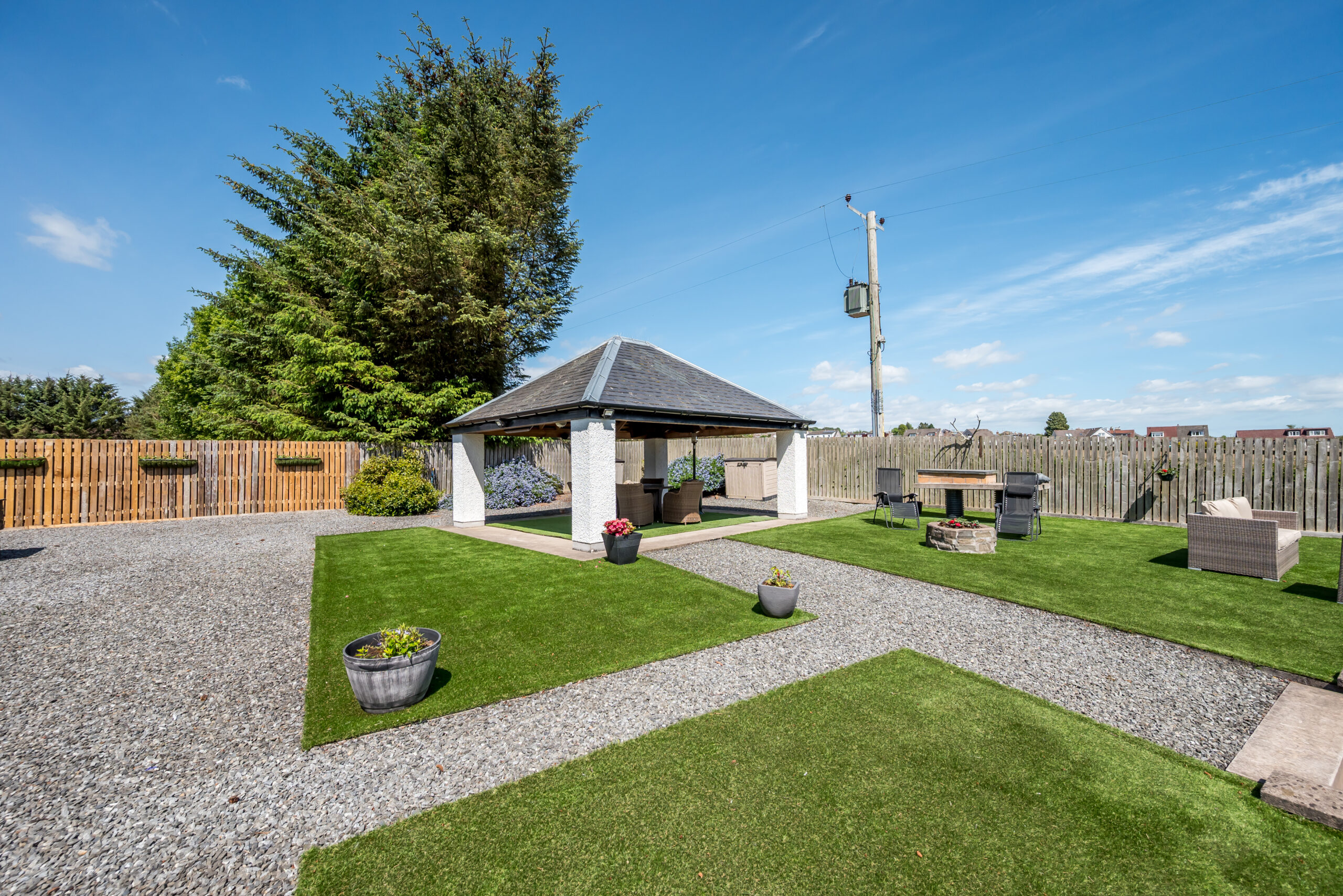 Outside, the rear garden has been thoughtfully designed for low-maintenance enjoyment, featuring artificial grass, a pergola with a slate roof and electricity, and generous space for outdoor dining or relaxing. The front lawn is equally well maintained, creating a strong first impression. Completing the picture is a large detached double garage, fully powered and fitted with a floored attic—offering superb storage or future potential.
