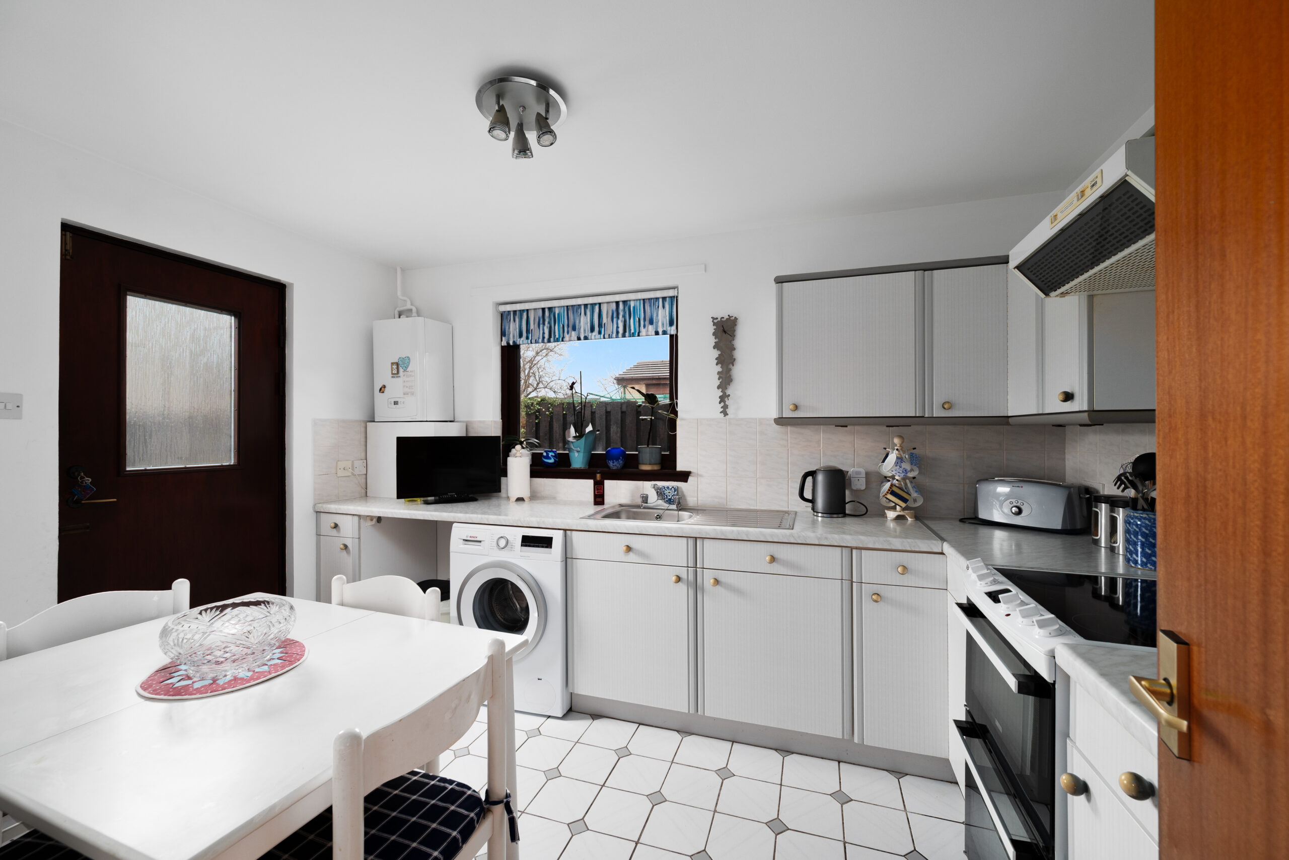 To the rear, the kitchen is neatly arranged with ample worktop space and room for a breakfast table, making it a sociable heart of the home. A door leads directly out to the garden, offering an easy connection to the outdoors and a practical layout for day-to-day living.